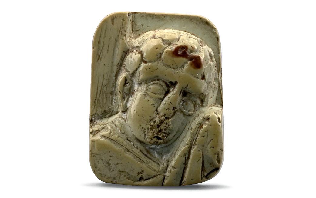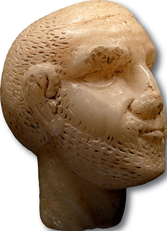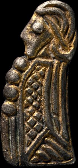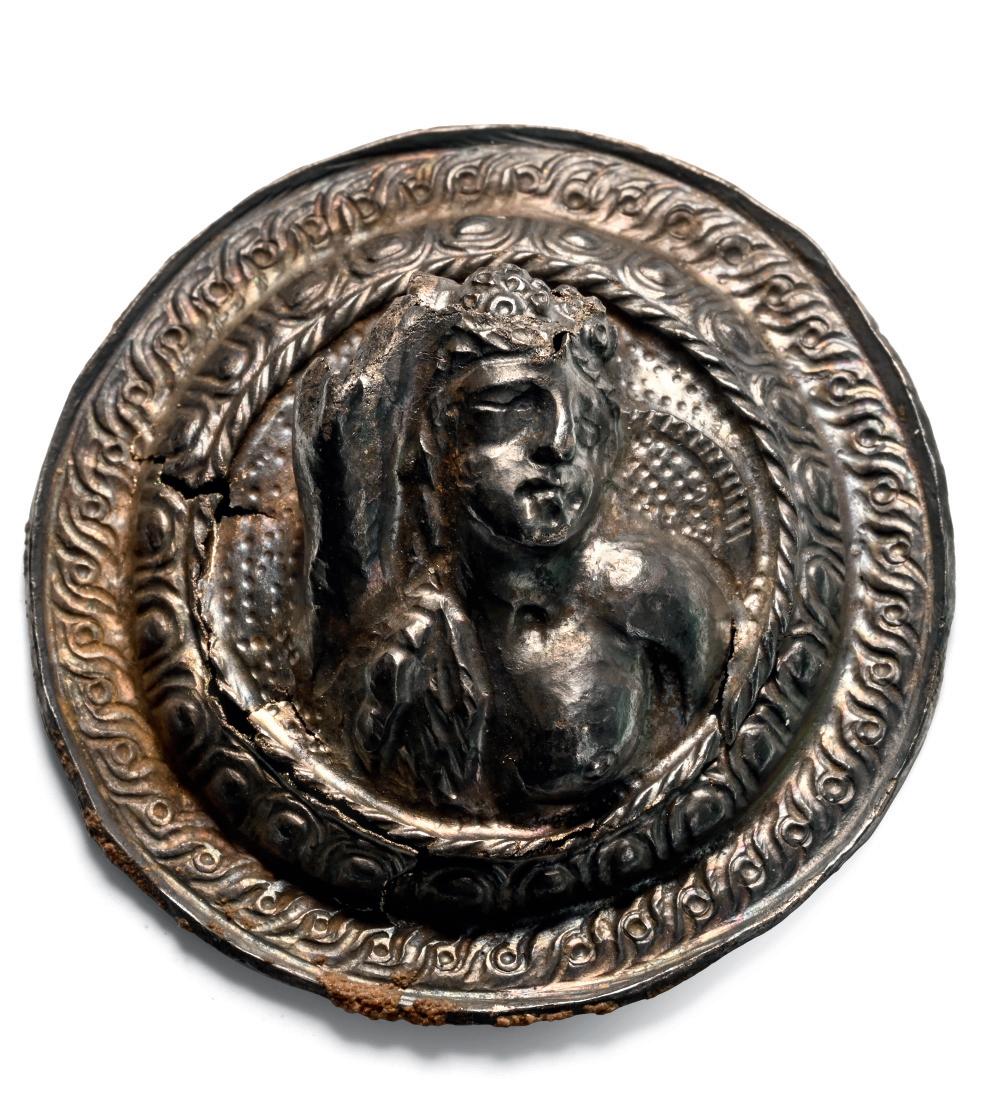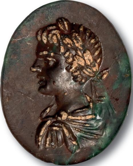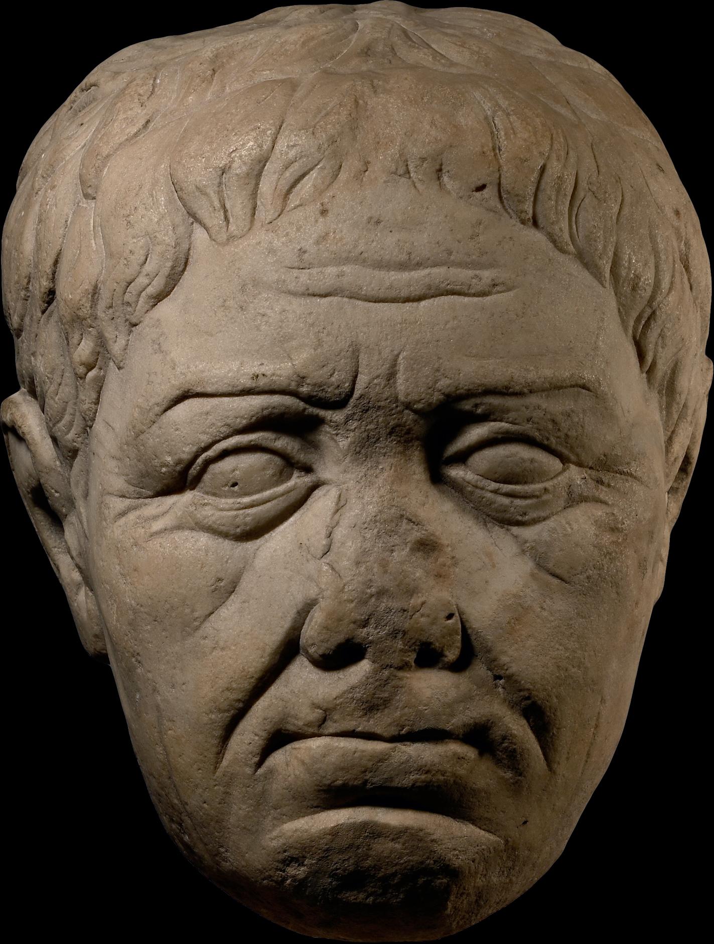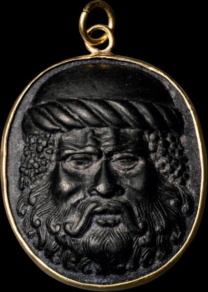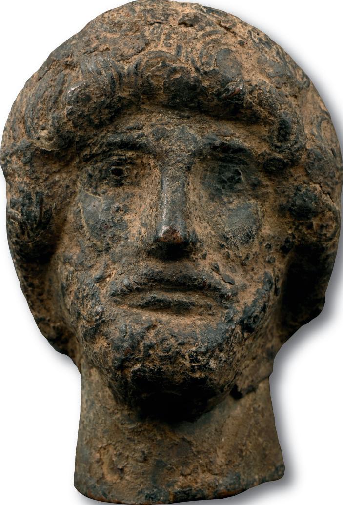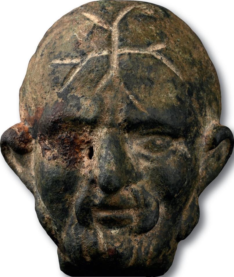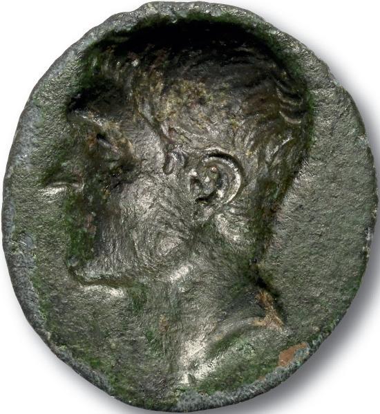 Plano-convex in section, incuse facing bust of an elderly man wearing a tunic and toga.