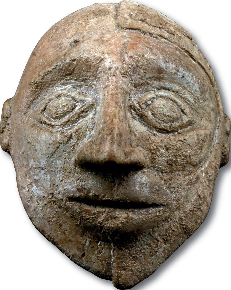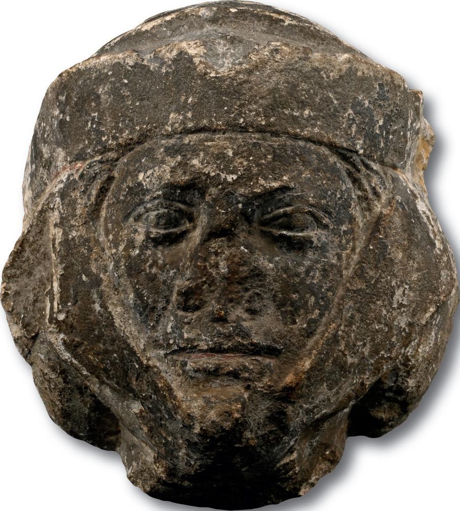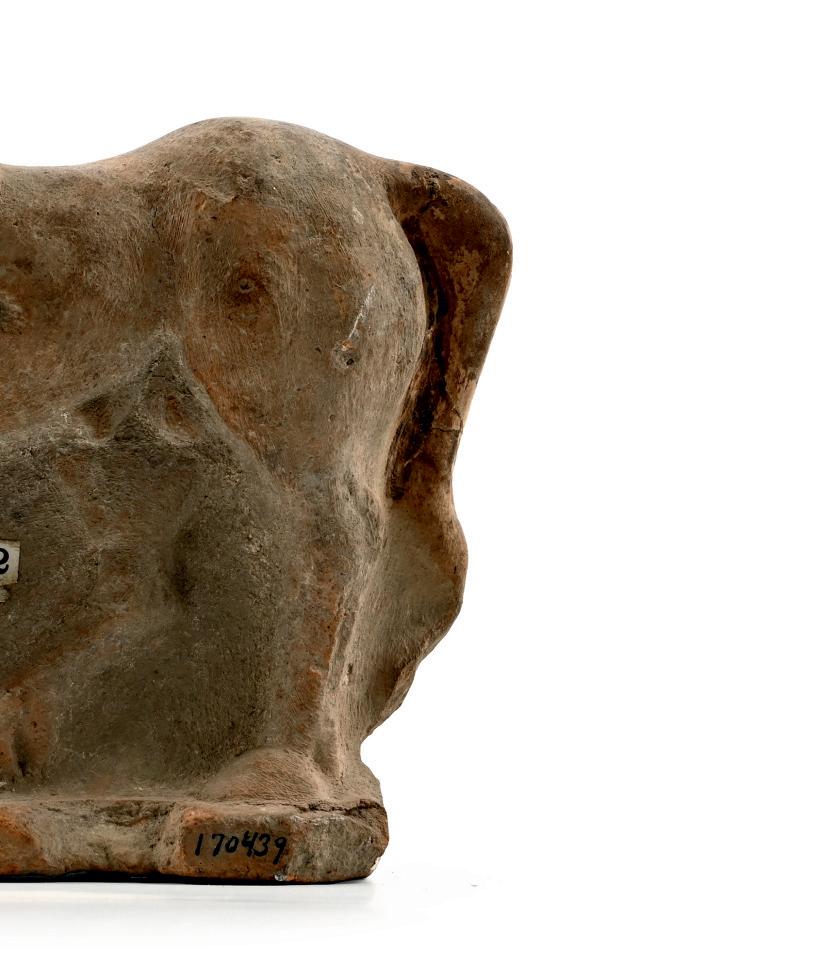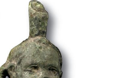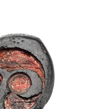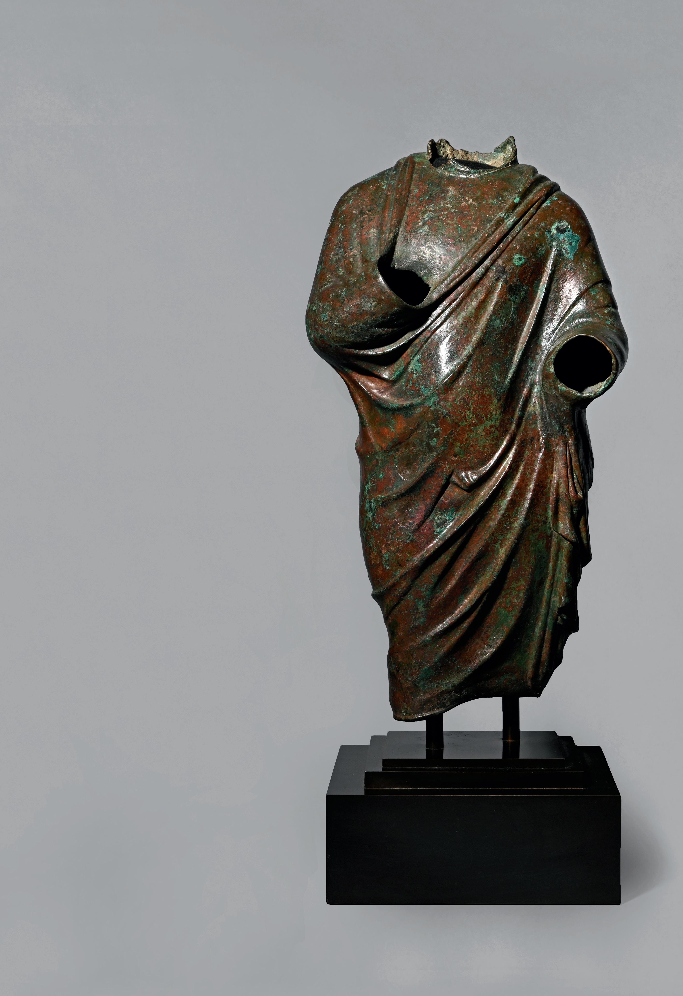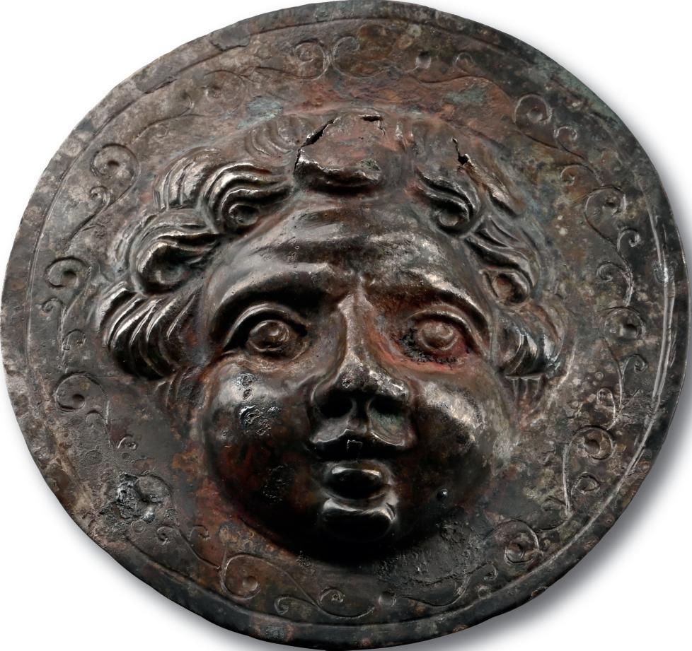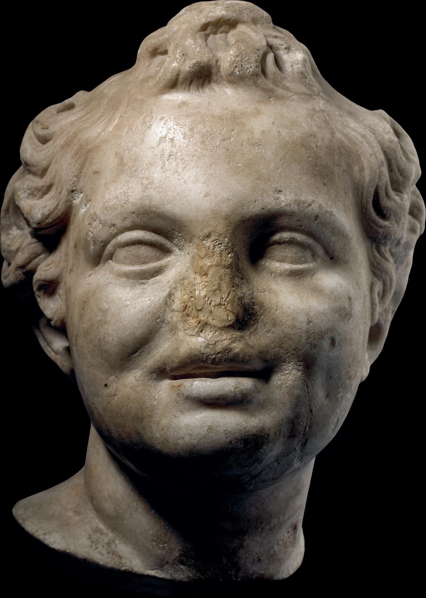 Plano-convex in section, incuse facing bust of an elderly man wearing a tunic and toga.