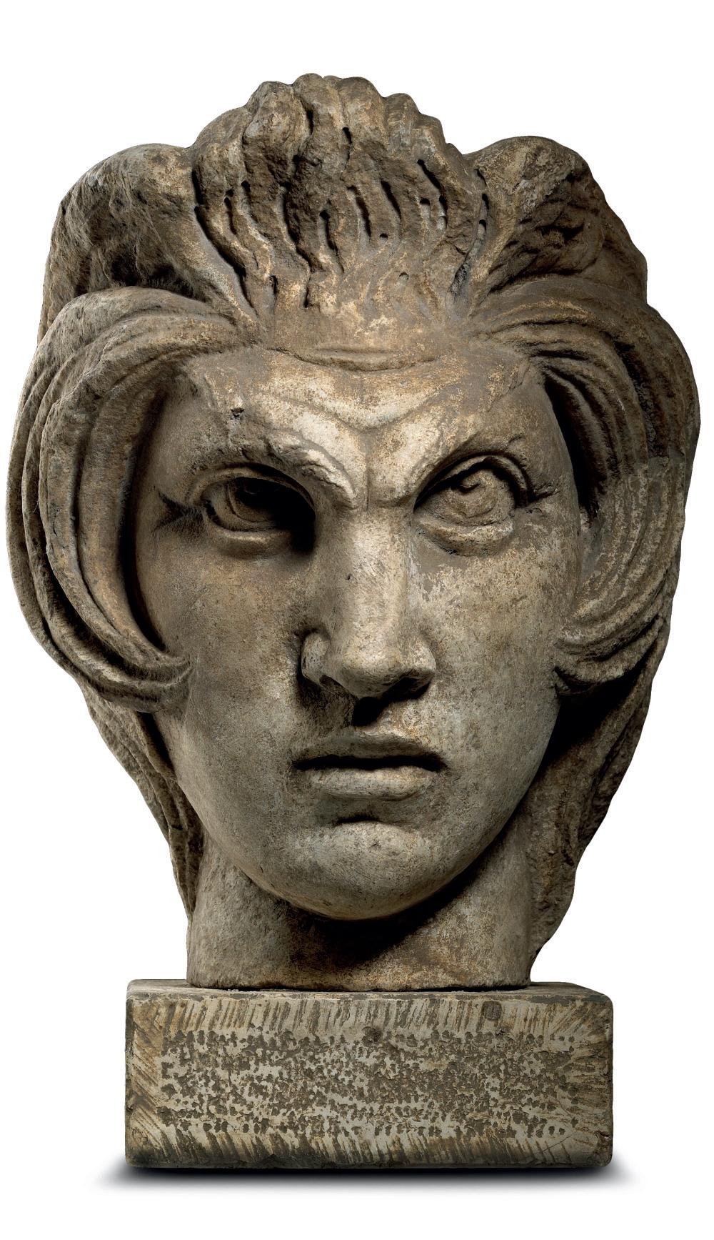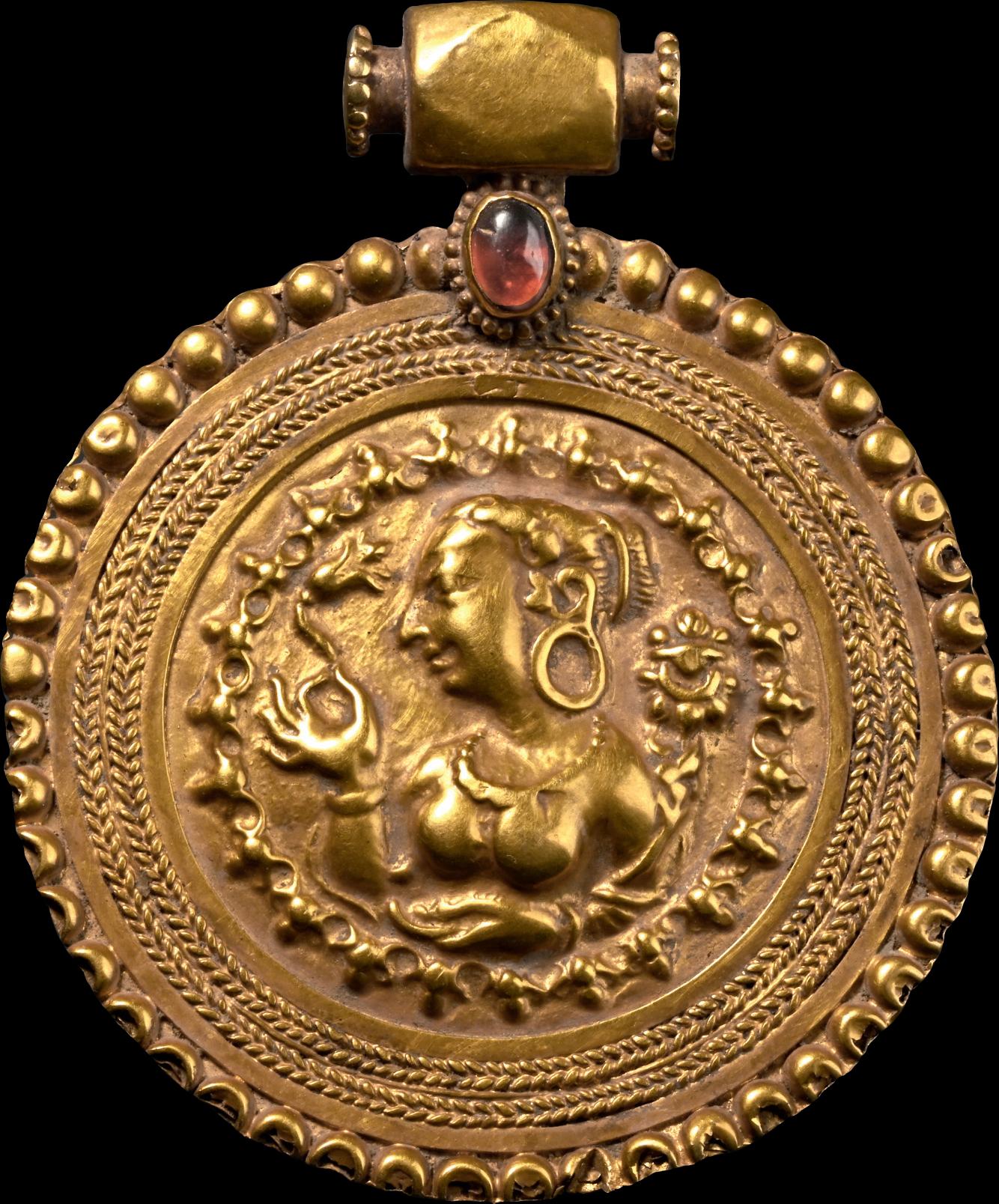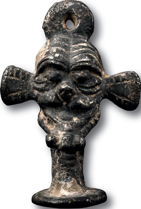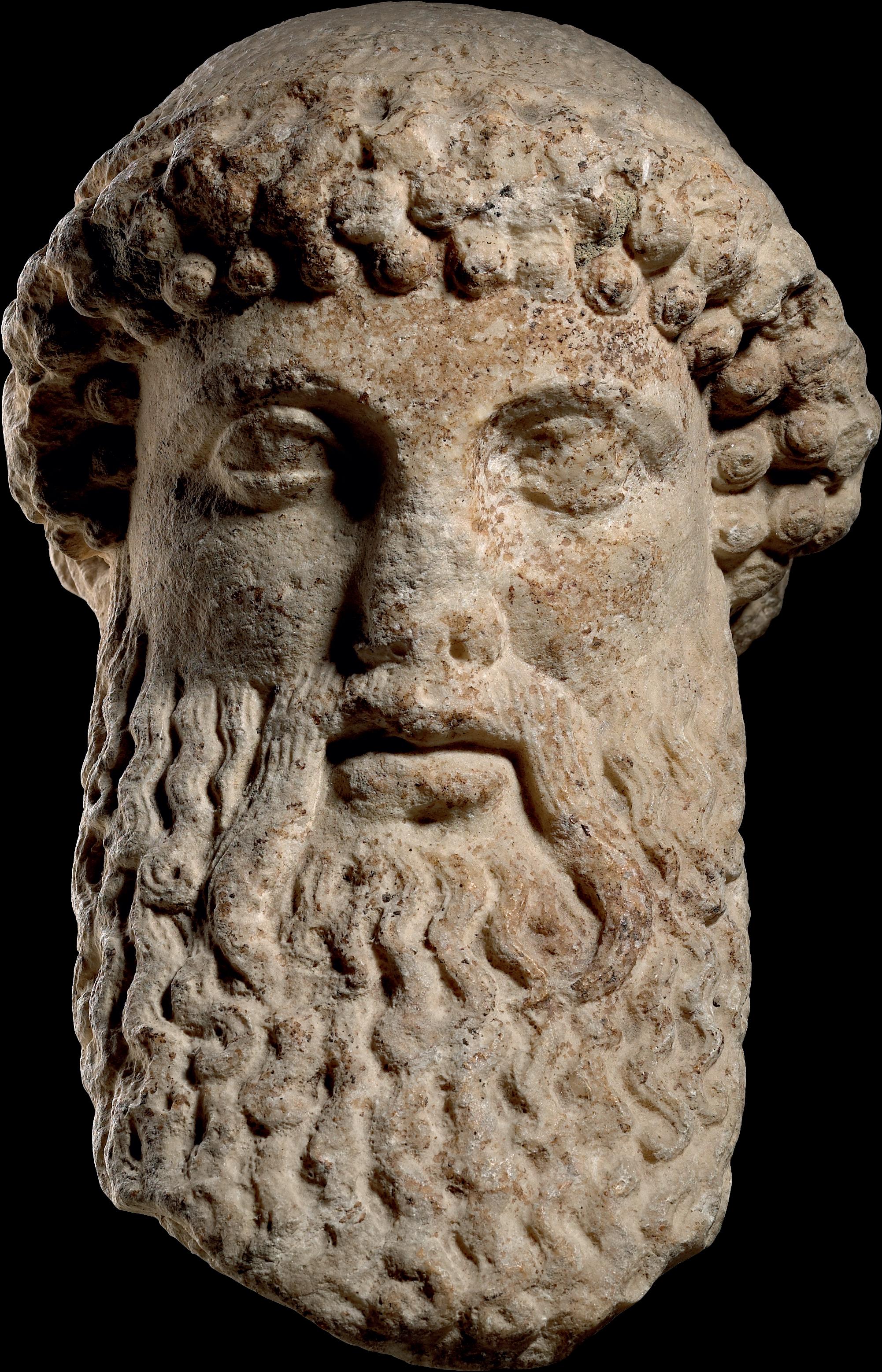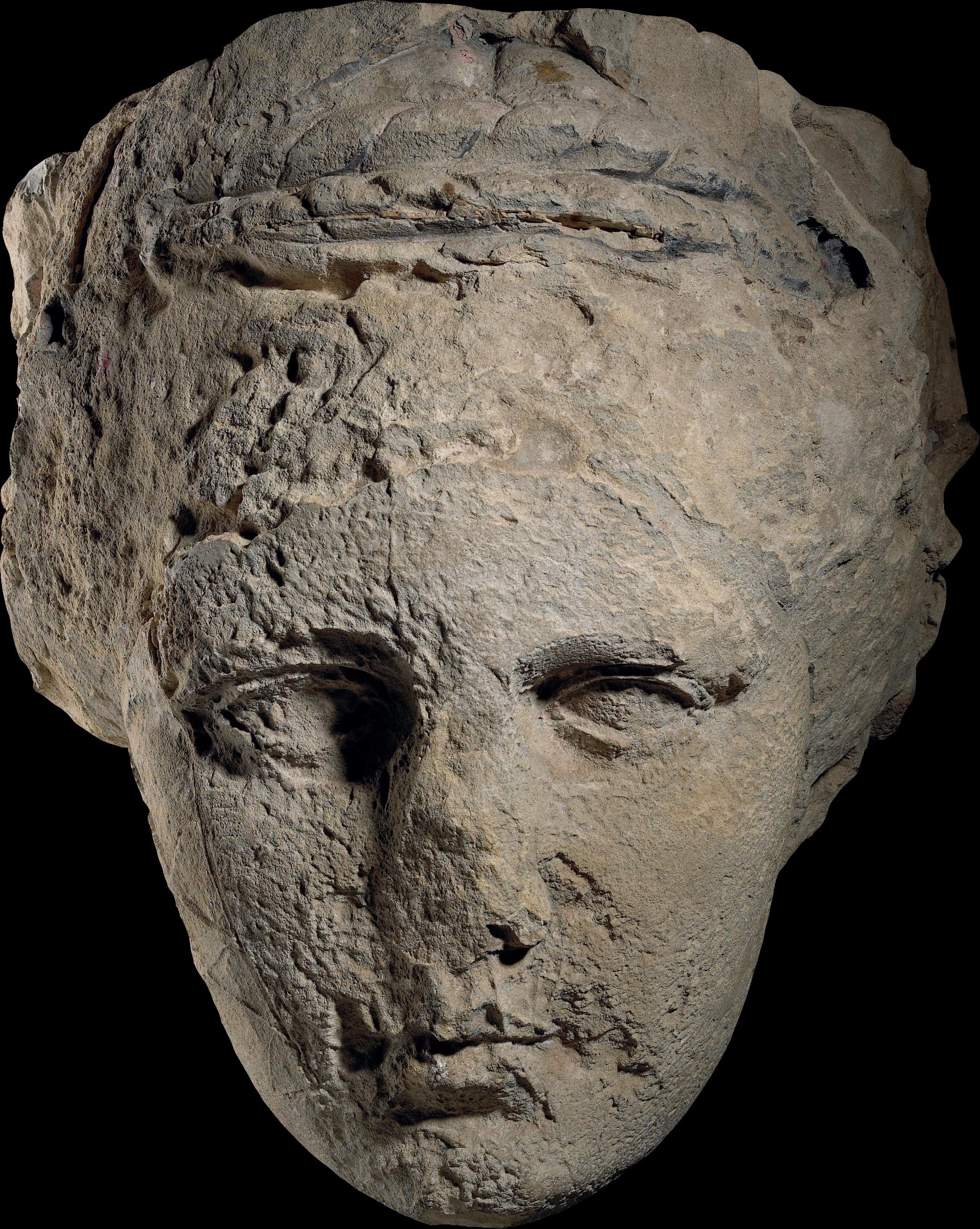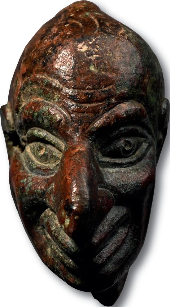Plano-convex in section, incuse facing bust of an elderly man wearing a tunic and toga.