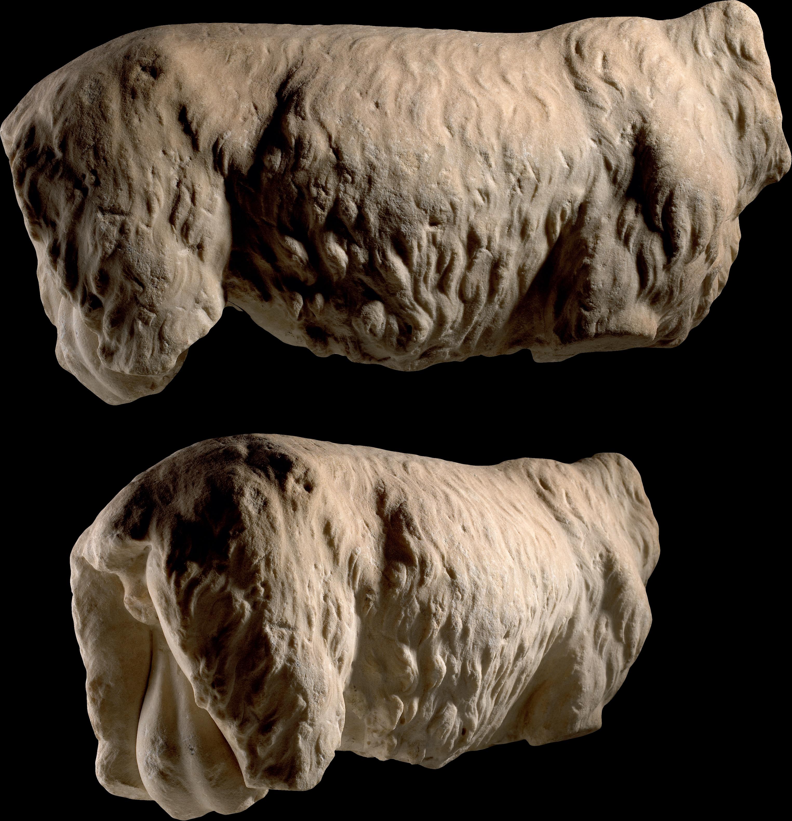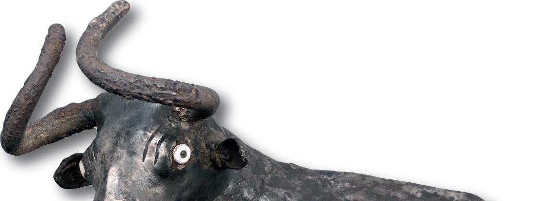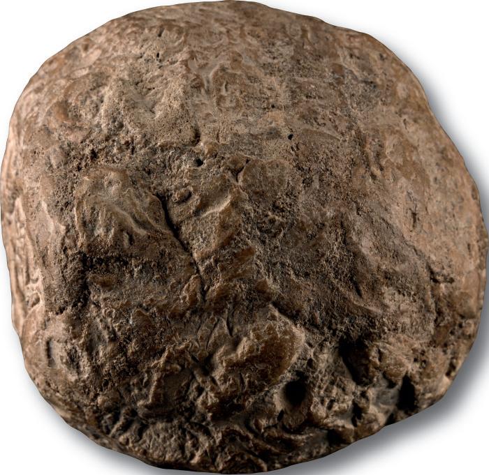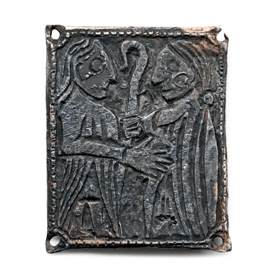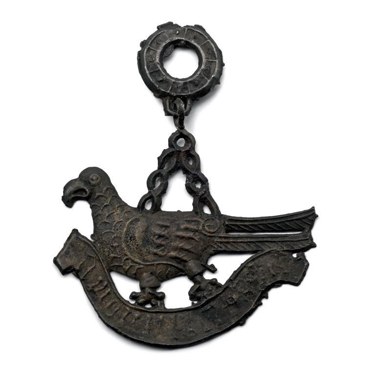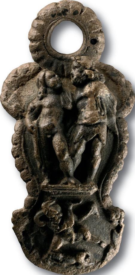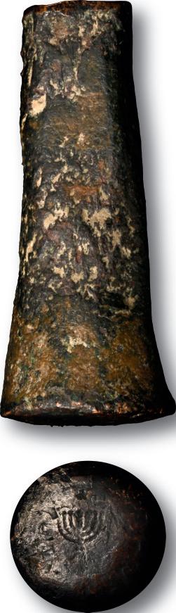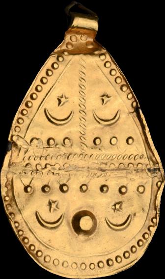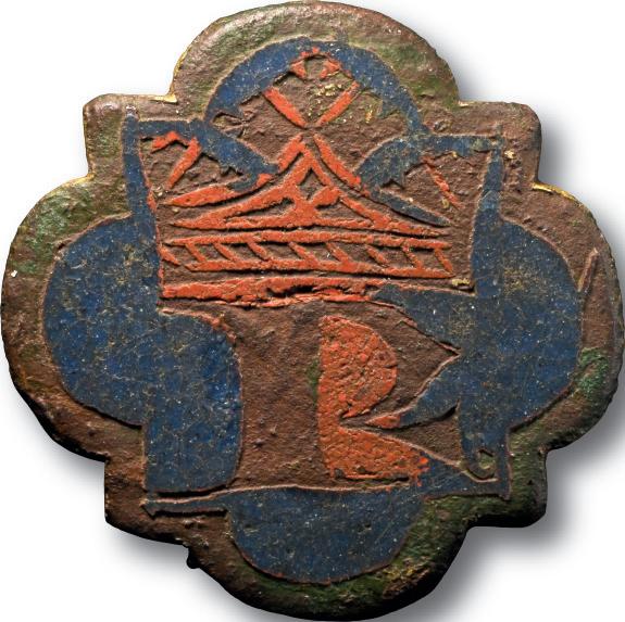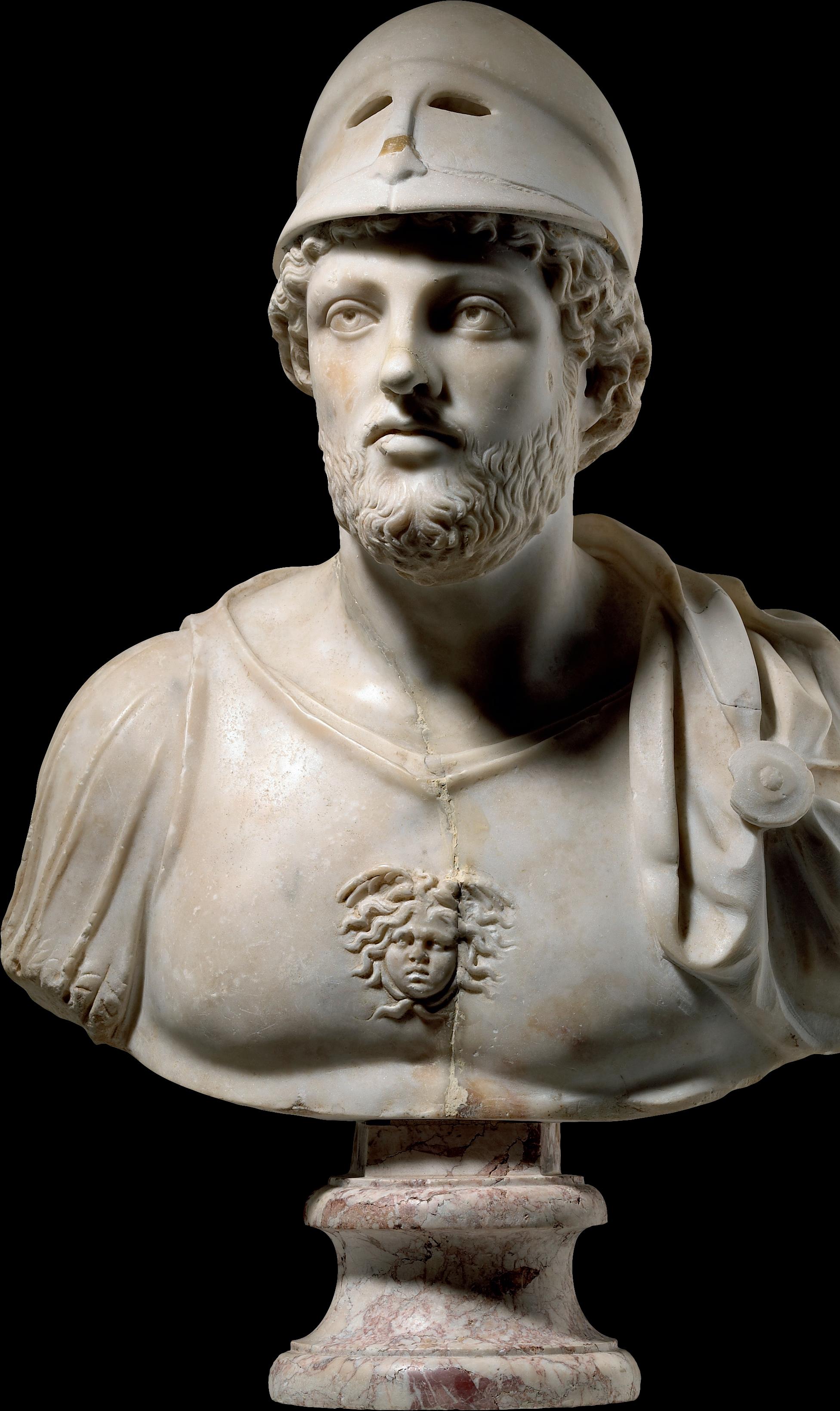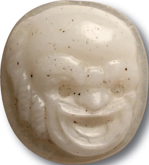 Plano-convex in section, incuse facing bust of an elderly man wearing a tunic and toga.