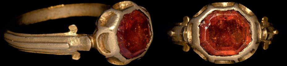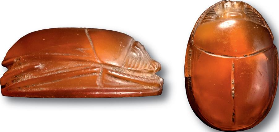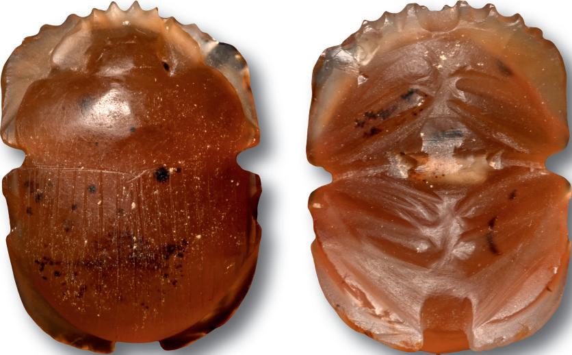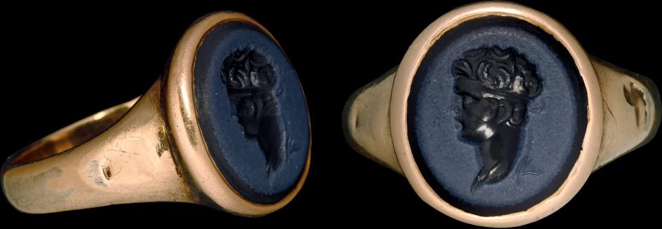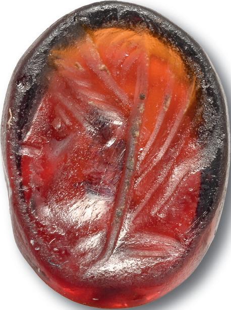 Orangey-red intaglio with a concave front and flat back, depicting the three-quarter bust of Serapis; displaying a tightly curled beard, shoulder-length wavy hair with a central parting brushed up from the forehead, wearing the characteristic calathus (woven basket or cornmeasure) headgear, symbolising fertility.