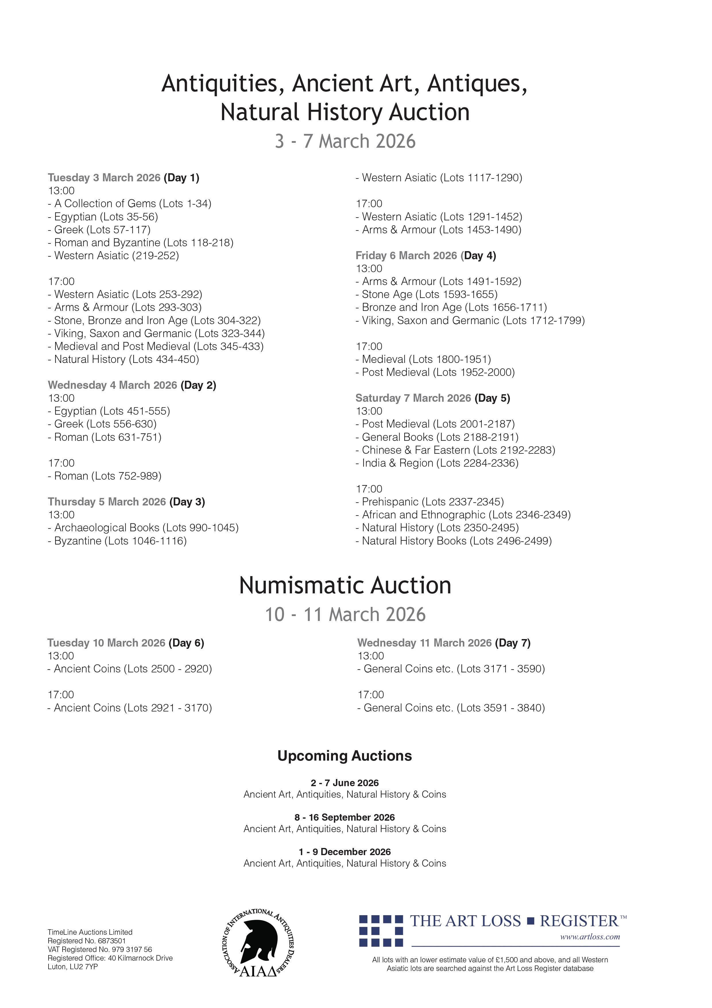 13. Lots: all goods submitted to TimeLine will be lotted, catalogued and offered by live auction sale, limited timed auction sale, 'buy it now' direct sale or other method at the sole discretion of TimeLine; antiquities, antiques and collectables Lots with a low Estimate of £200 or less and coin Lots with a low Estimate of £100 or less will not normally be illustrated in any printed catalogue and printed text entries may be minimised (images and full text will always be shown on the TimeLine website); Estimates are provided for information only and Hammer Prices may differ from the estimated range.