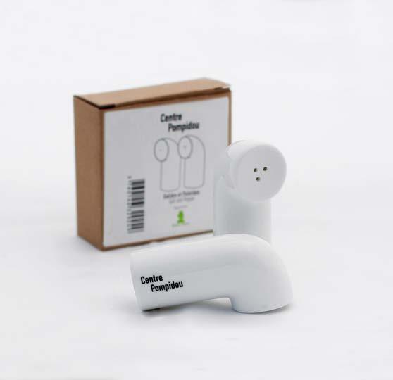 Salière et poivrière en porcelaine blanche, créés par Reine Mère pour la boutique du centre national d’art et de culture Georges-Pompidou à Paris.