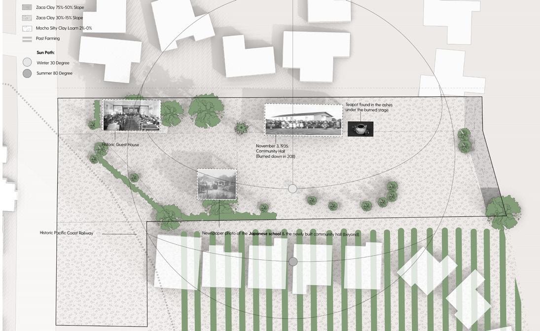 Our project design started with recognizing the social and economic obstacles the Japanese-American community in Arroyo Grande went through during the second World War. The site has hidden stories of family farming and the pursuit to protect Japanese-American cultural integrity. With the help of community members of Arroyo Grande,we gathered enough infomation from books, articles, and memory to pinpoint where each significant building use to sit on the site.