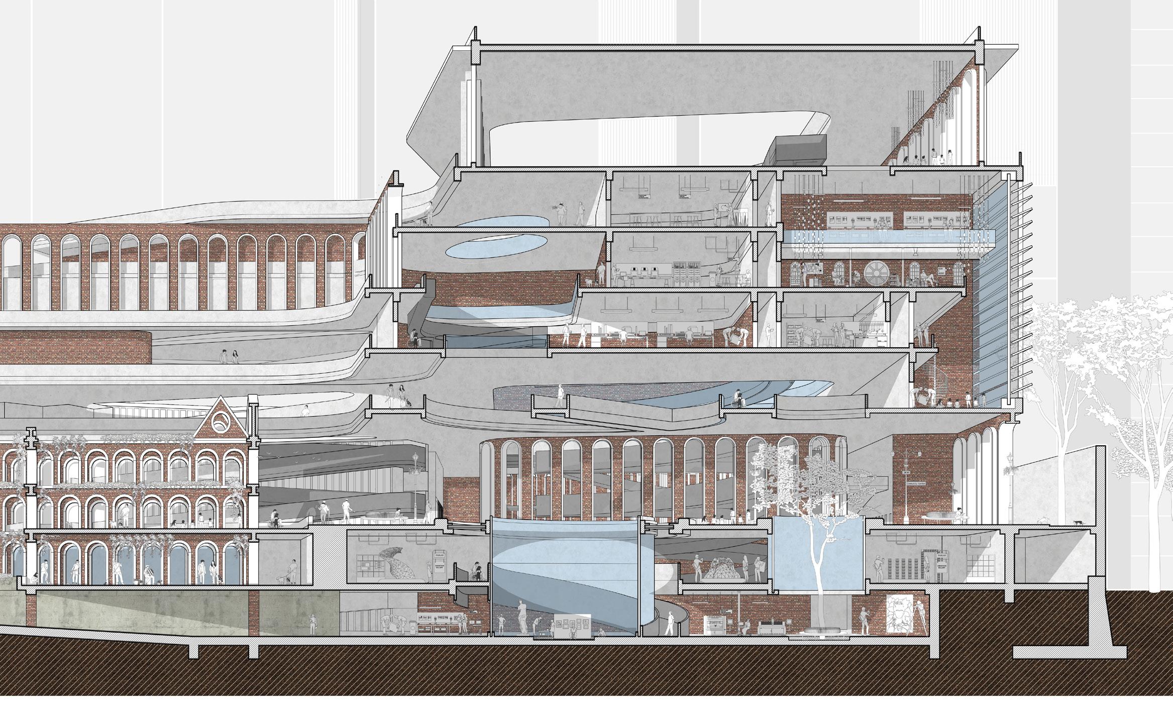 The old mill facade is supported with new reinforcement which would help it stand for the next generation. Ramps and bridges are introduced to connect multiple old spaces and pockets with the new nokes and corners. No program is introduced in the old mill compound as to formally give its open space to the community so that one could experience the rich green fabrics of the lush grown nature is the middle of the city.