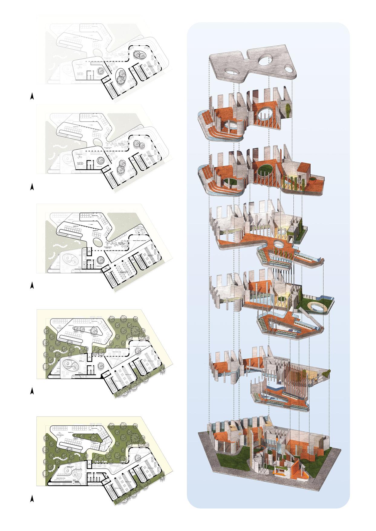 The idea is to proposal a Grove which is open to public and is supported by variously community spaces with a major of public library. Inspired by nature and trees, the proposal envelopes around fruit trees and vegetable orchards. The key is to create a public space in a grove.