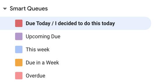 The Smart Queues are time related and I love this feature! It shows me what I told it to show me so I can be reminded to finish the task, or move it out a few days.