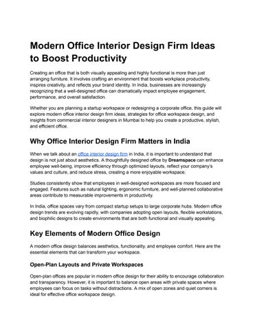 Dreamspace India is a Mumbai‑based design and build firm creating innovative, high‑performance workspaces. Since 2004, they deliver turnkey interior and architectural solutions that inspire productivity, enhance brand identity, and transform office environments across India.