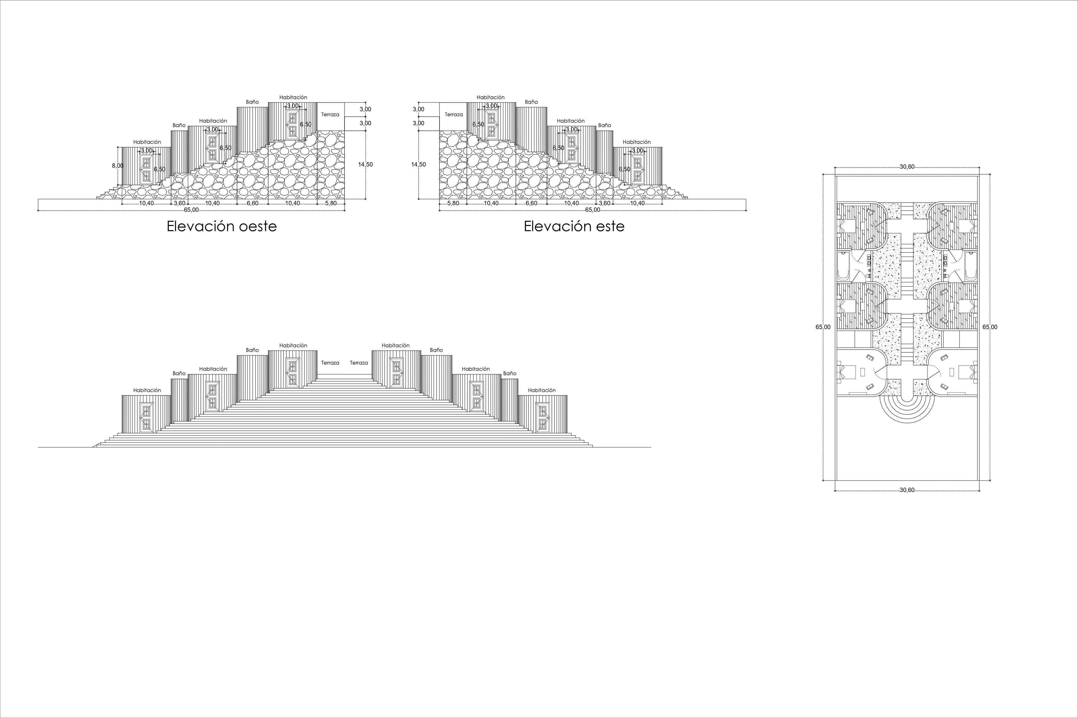 La geometrÃa del proyecto esta compuesta por cuadrados y rectángulos que rotan al norte lo que permite al proyecto determinar sus accesos y tener una vista hacia el entorno natural del lugar