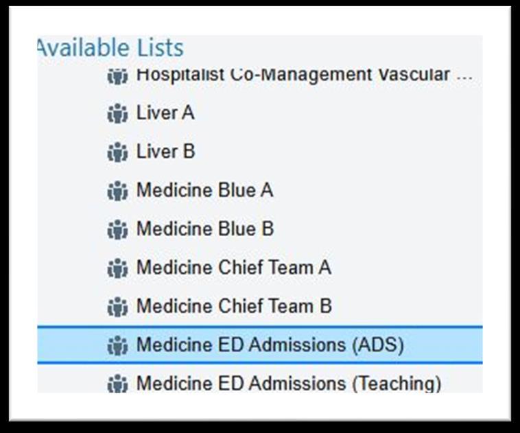 Key Tip for Finding ADS Admits: Find these patients in Epic under MSH Provider teams → Medicine → Medicine ED admissions folder. Sort the list by Attending to see patients assigned to you, then drag them to your personal folder.