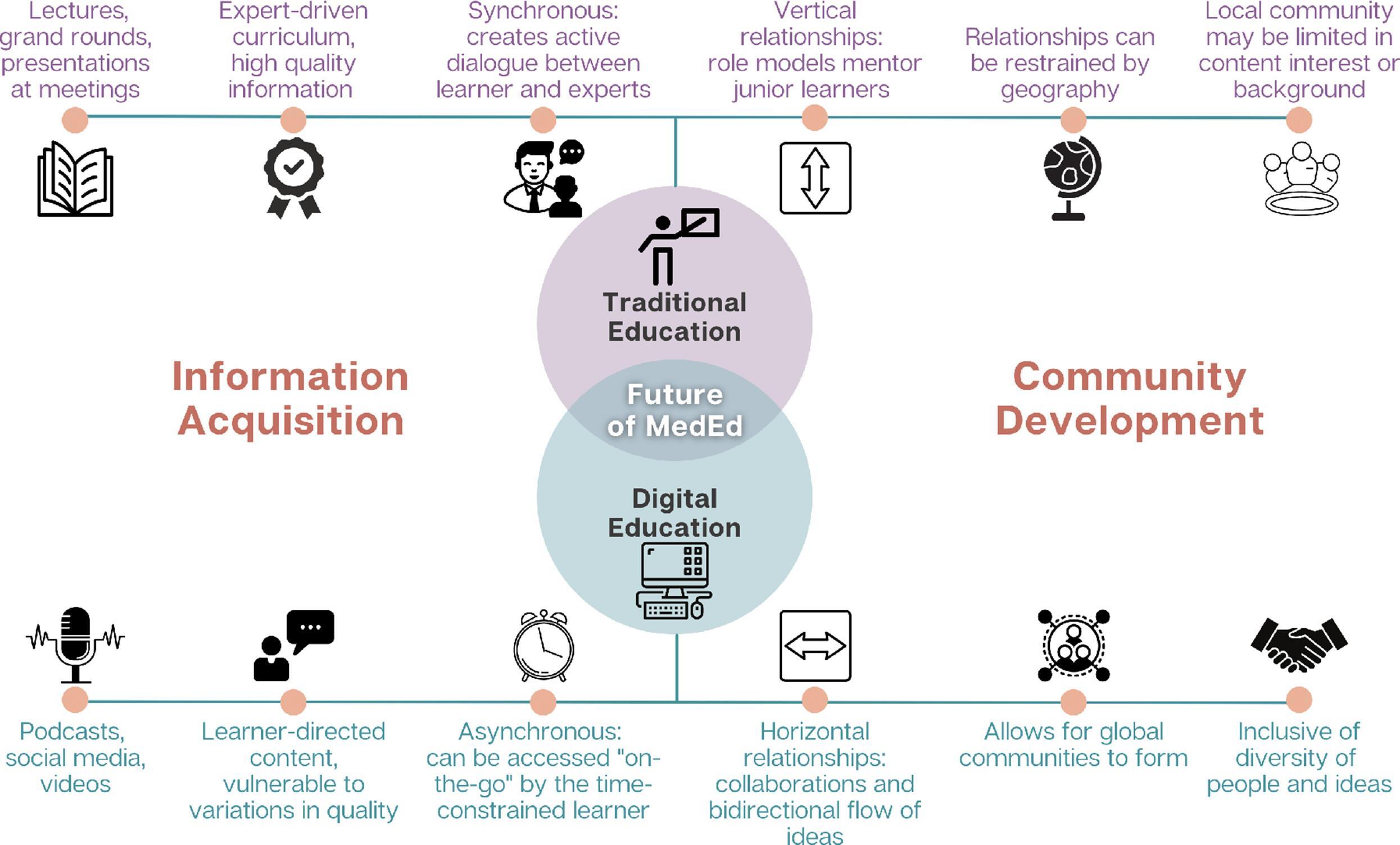 While it has been ongoing for several years, the digital transformation was accelerated by the COVID-19 pandemic. Physical distancing mandates created a vacuum in traditional inperson didactic curricula, spurring a rapid proliferation in digital platforms and content. In this new educational landscape, the digital space has become integral to how we access information and communicate with one another. Thus, the modern medical educator must be able to deliberately appraise both the advantages and pitfalls of the digital world and traditional modalities. Our challenge now is to thoughtfully integrate digital and traditional platforms to help the modern learner effectively acquire information and build community