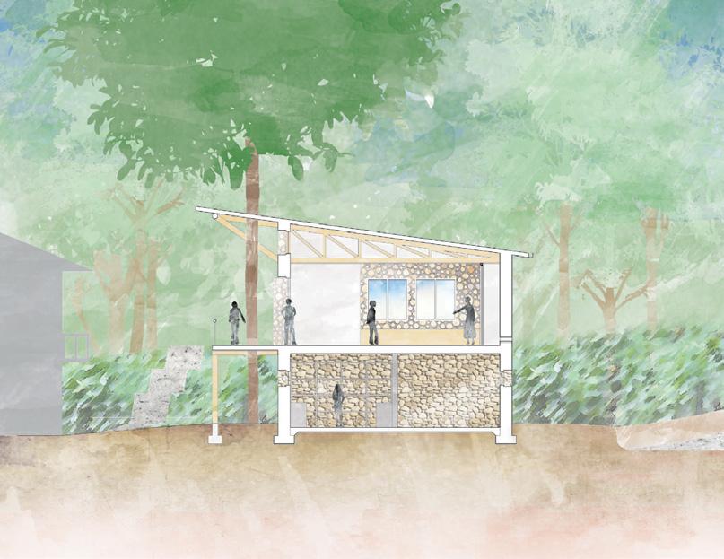 La Casa del Arbol a near total reconstruction of an existing shed on site, which contains a mountain of scrap materials, mainly wood. It seeks to minimize this kind of constuction waste by using wood in its complete, round form in both structure and skin. All stone is rough cut and local, and the metal roof is found commonly in the area.