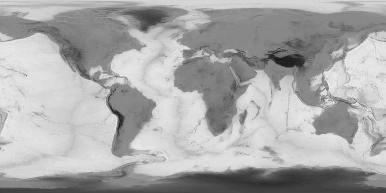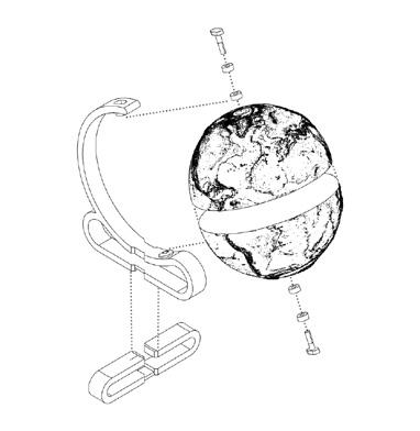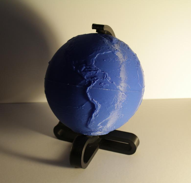 The globe was generated using a heightmap. The grasshopper script takes this samples grid of points on this image and translates the grayscale value into the height of a corresponding vertex on a rectangular mesh. Then, the mesh is projected around a sphere. The stand is designed in Rhino to mount the globe on pins with bearings for free spinning.