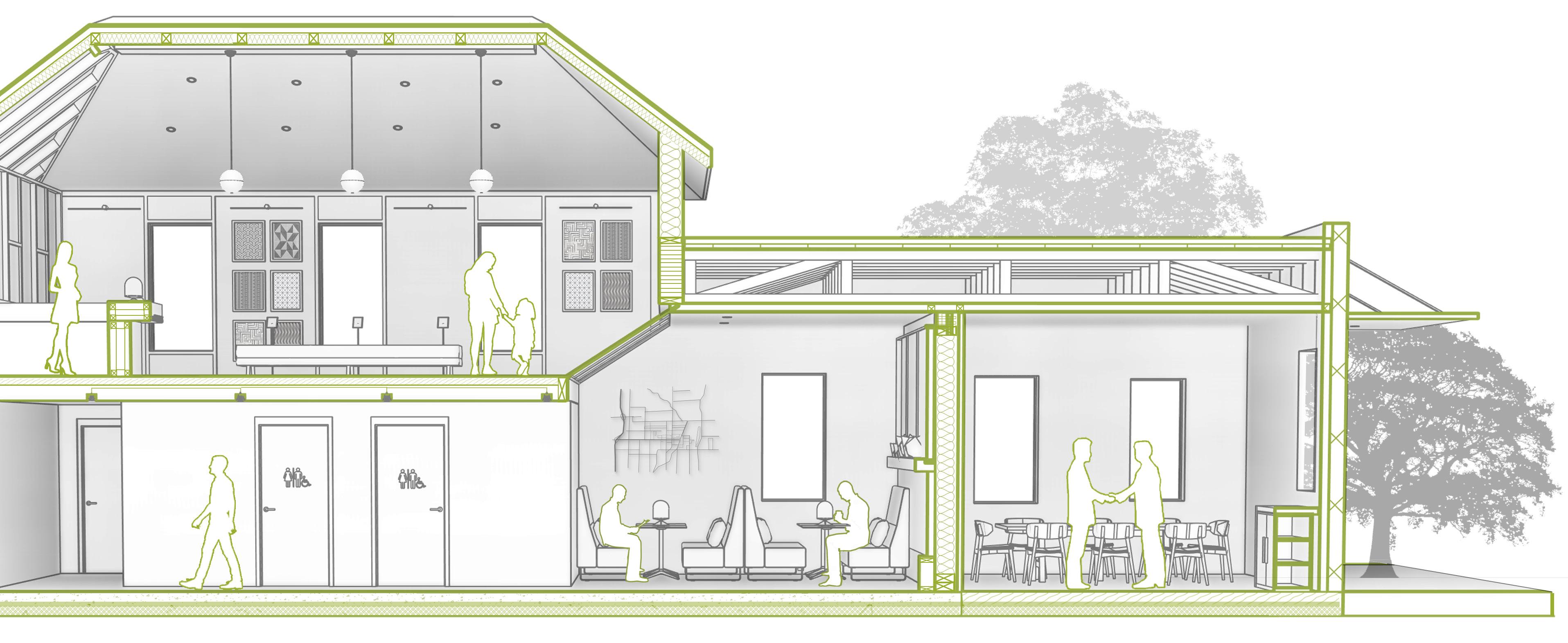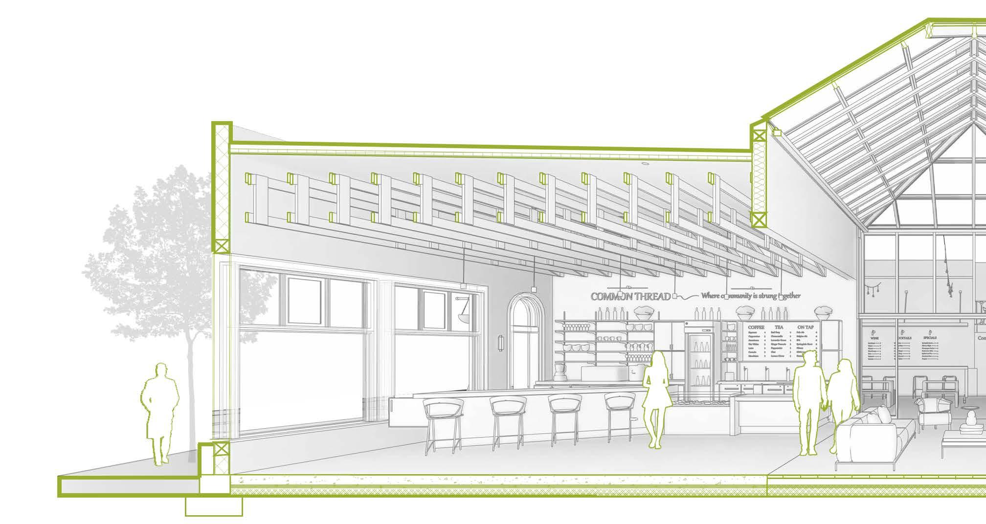 “Common Thread”is an adaptive reuse Coffee and Music house that aims to revitalize the face of Emma Avenue in downtown Springdale, Arkansas. As a result of in-depth research and experimentation, the project embraces forward-thinking and sustainability by integrating recycled materials and upcycled designs into its aesthetic and functionality.
