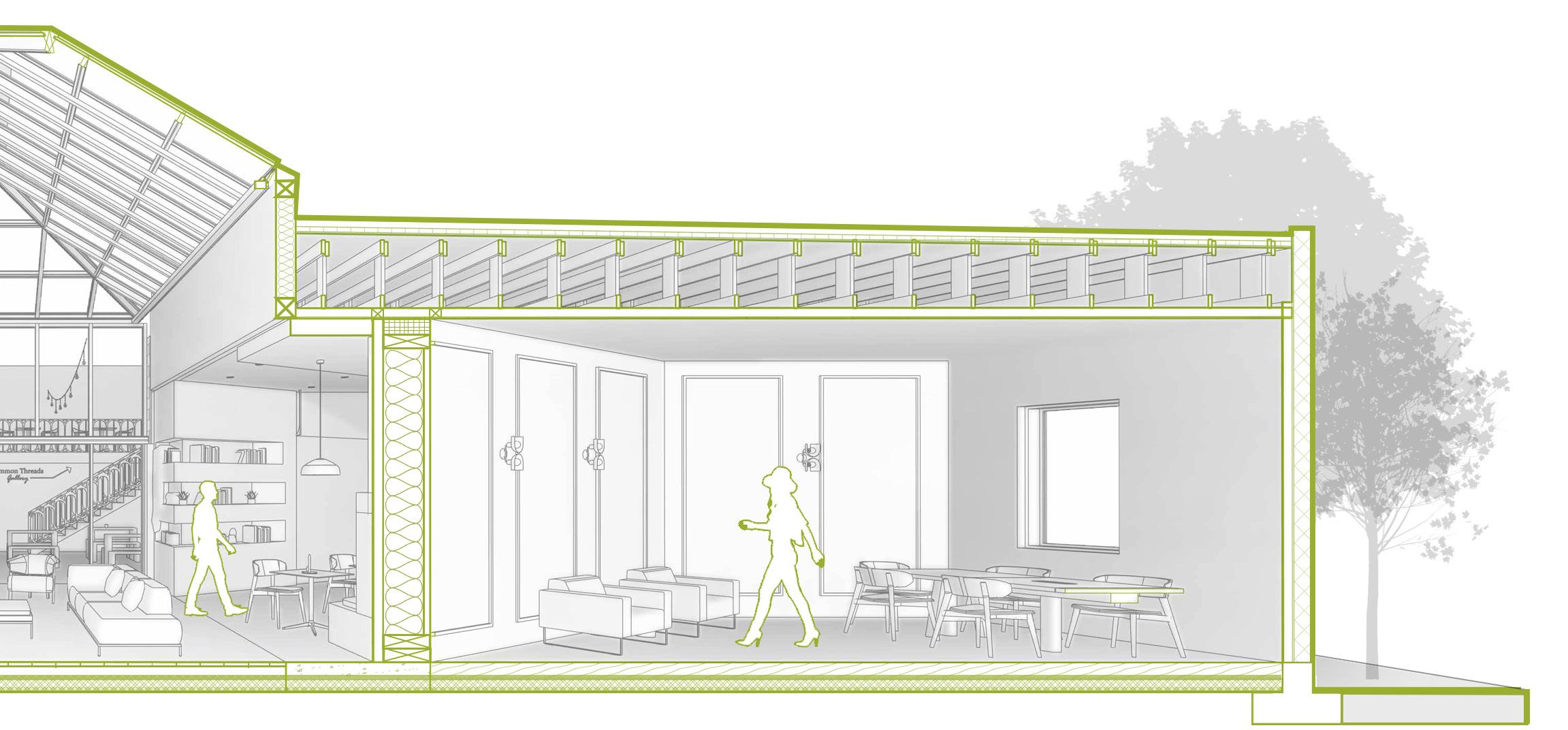 The material focus of Common Thread is cotton, which is soft, fluffy staple fiber that grows in a boll, or protective case, around the seeds of the cotton plant. It is composed primarliy of cellulose, glucose, and fiber. Cotton is most commonly used in architecture and design through upholstery, drapery, or acoustic solutions. This adaptive reuse project seeks to push boundaries of cotton in construction by utilizing both its organic and recycled forms.