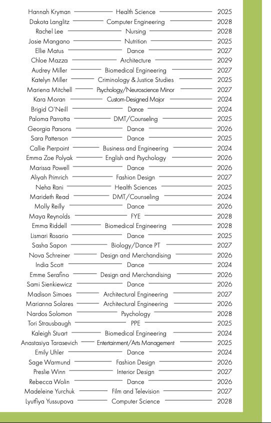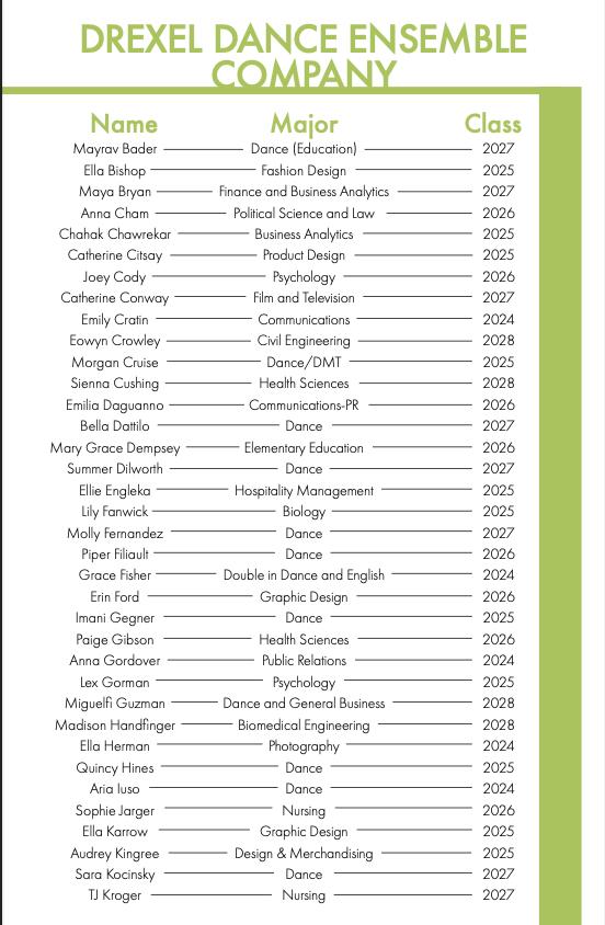 Dancers: Mayrav Bader, Chahak Chawrekar, Ellie Engleka, Grace Fisher, Anna Gordover, Lex Gorman Kaitlin Gwanmesia, TJ Kroger, Chloe Mazza, Kara Moran, Brigid O’Neill, Sage Warmund