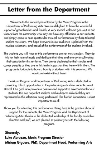 The Antoinette Westphal College of Media Arts & Design at Drexel University is dedicated to the multidisciplined education of students in the areas of design, media and the performing and visual arts. Westphal offers 16 undergraduate majors, 28 undergraduate minors and seven graduate programs housed in award-winning, technologically-enhanced facilities including, two performing arts theaters, a film screening room, an art gallery, a notable collection of over 30,000 historic costumes, a record label, and a world-class music studio. Westphal values a studio approach to classes, which are taught by industry-leading faculty who are at the top of their diverse disciplines. Drexel’s renowned cooperative education program (Co-op) incorporates six months of professional experience into the curriculum for all undergraduate students. Students produce sophisticated work through creative, multi-disciplinary practices, which provides meaningful shared experiences that promote individual and communal growth. Eleven of Westphal’s programs enjoy national rankings, and Westphal is ranked one of the best Design & Applied Art schools in the nation. This ISSUU is just an example of the extraordinary work that the Westphal community creates. To learn more about the college, visit drexel.edu/westphal.