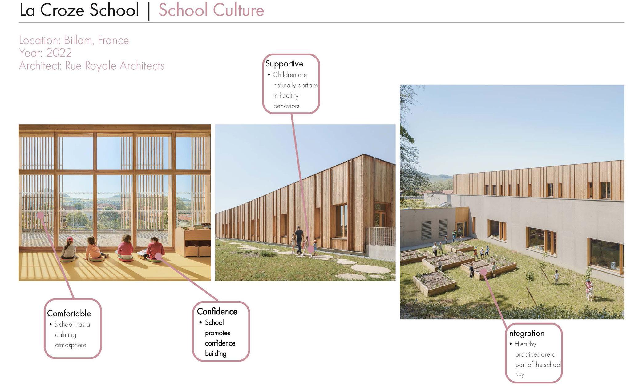 For my research method, I chose to evaluate case studies of different schools with architecture and design elements that have the ability to affect student health practices. I then created a design matrix (Figure 3) based off my student health practice design guidelines and graded the case studies based on their success in relation to the categories within my design guidelines.