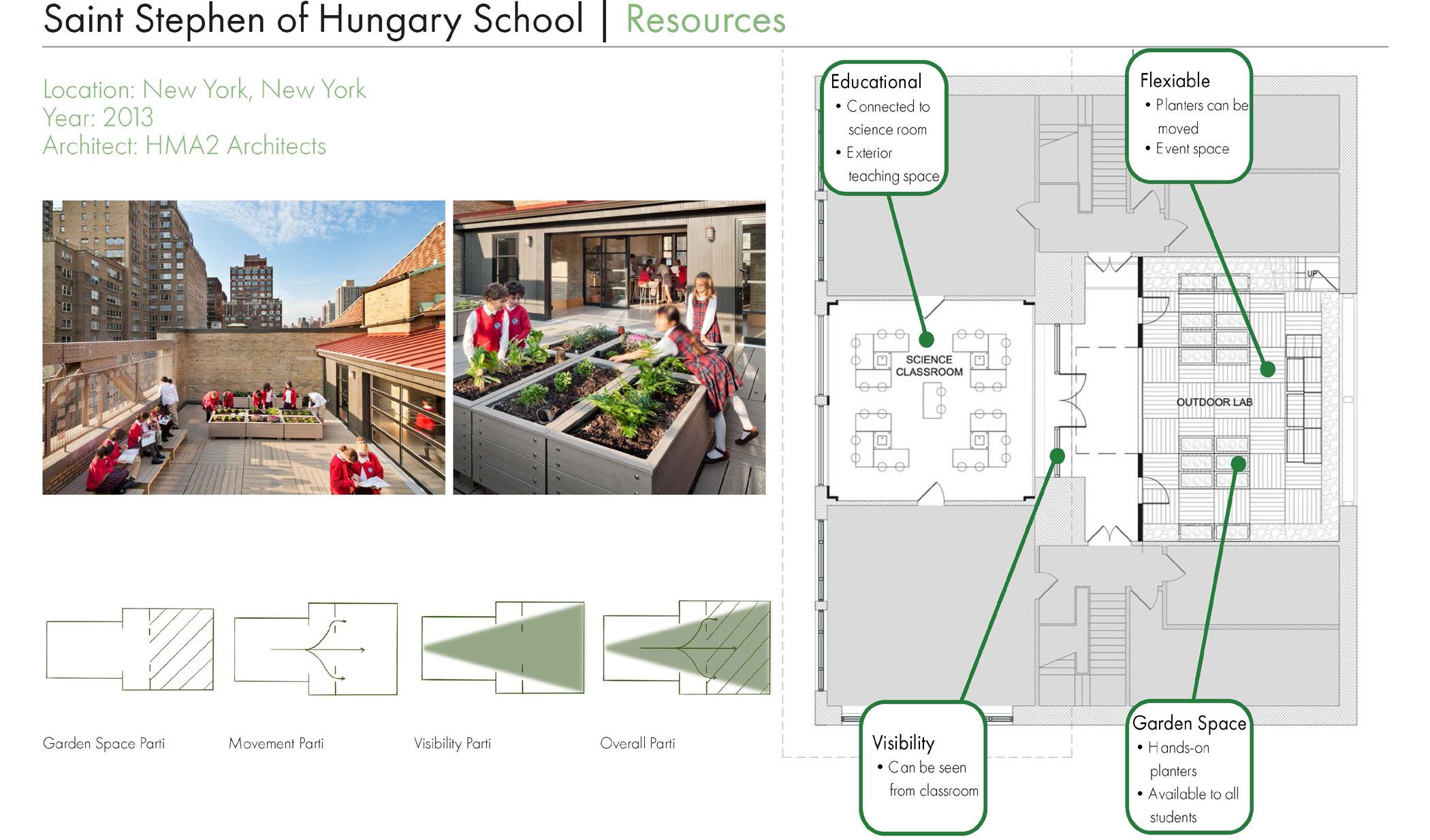 The Saint Stephen of Hungary School, located in New York, had resources like a science classroom that connected to an outdoor lab space with planters that the children use to learn about food growth and the importance of healthy eating. This outdoor space is flexible and the planters can be easily moved to allow for this patio space to function not only as a garden space, but also as an event space. The flexibility of the space allows for healthy lifestyle messaging to be highlighted outside of the classroom to the community as well.