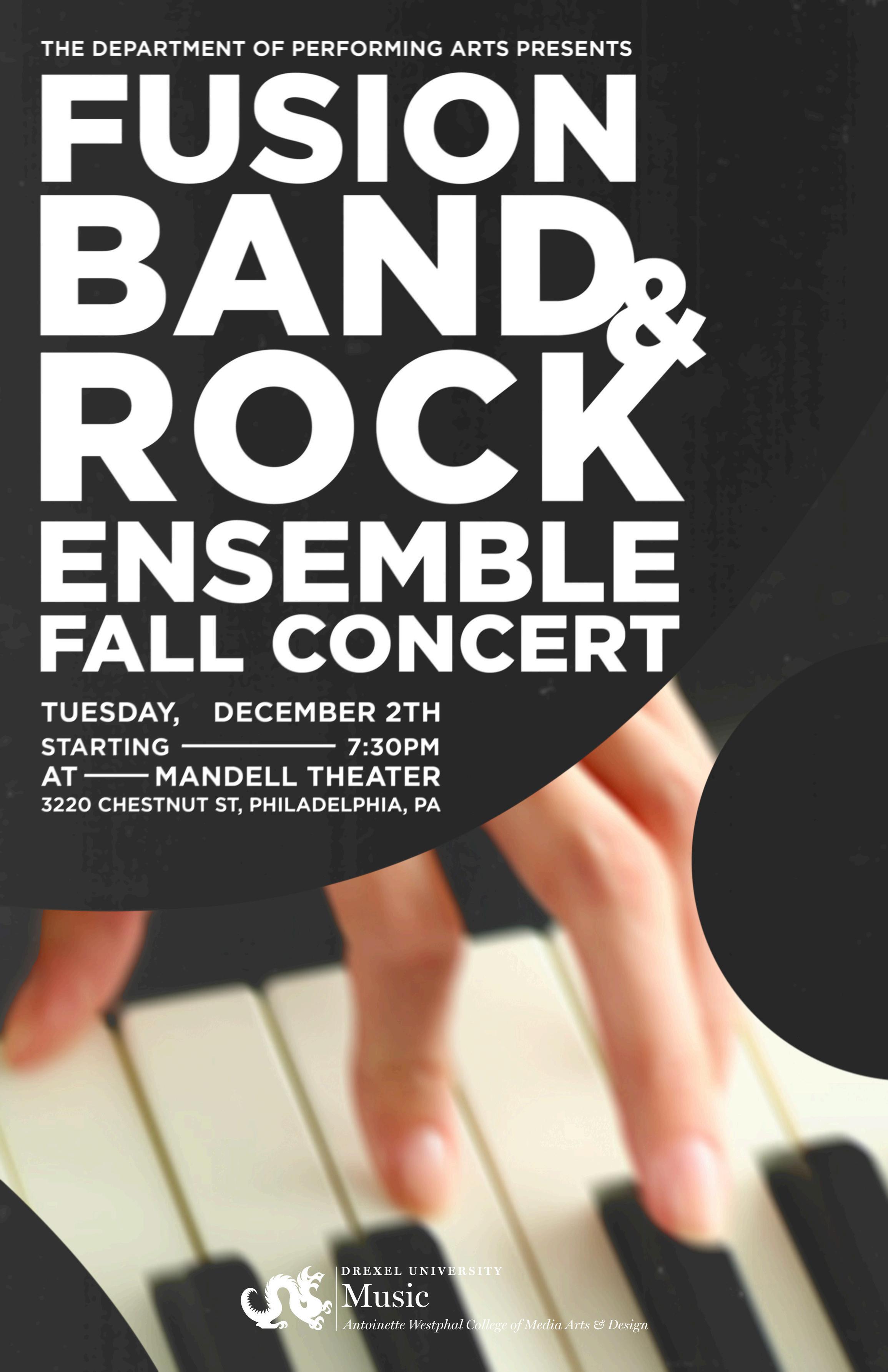 The Drexel Fusion Band and Drexel Rock Ensemble would like to thank everyone in the Performing Arts office: Ellie Ebby, Hannah Burke, Elisha Robinson, Lauren Tracy, and our fearless leaders, Luke Abruzzo & Dr. Miriam Giguere.