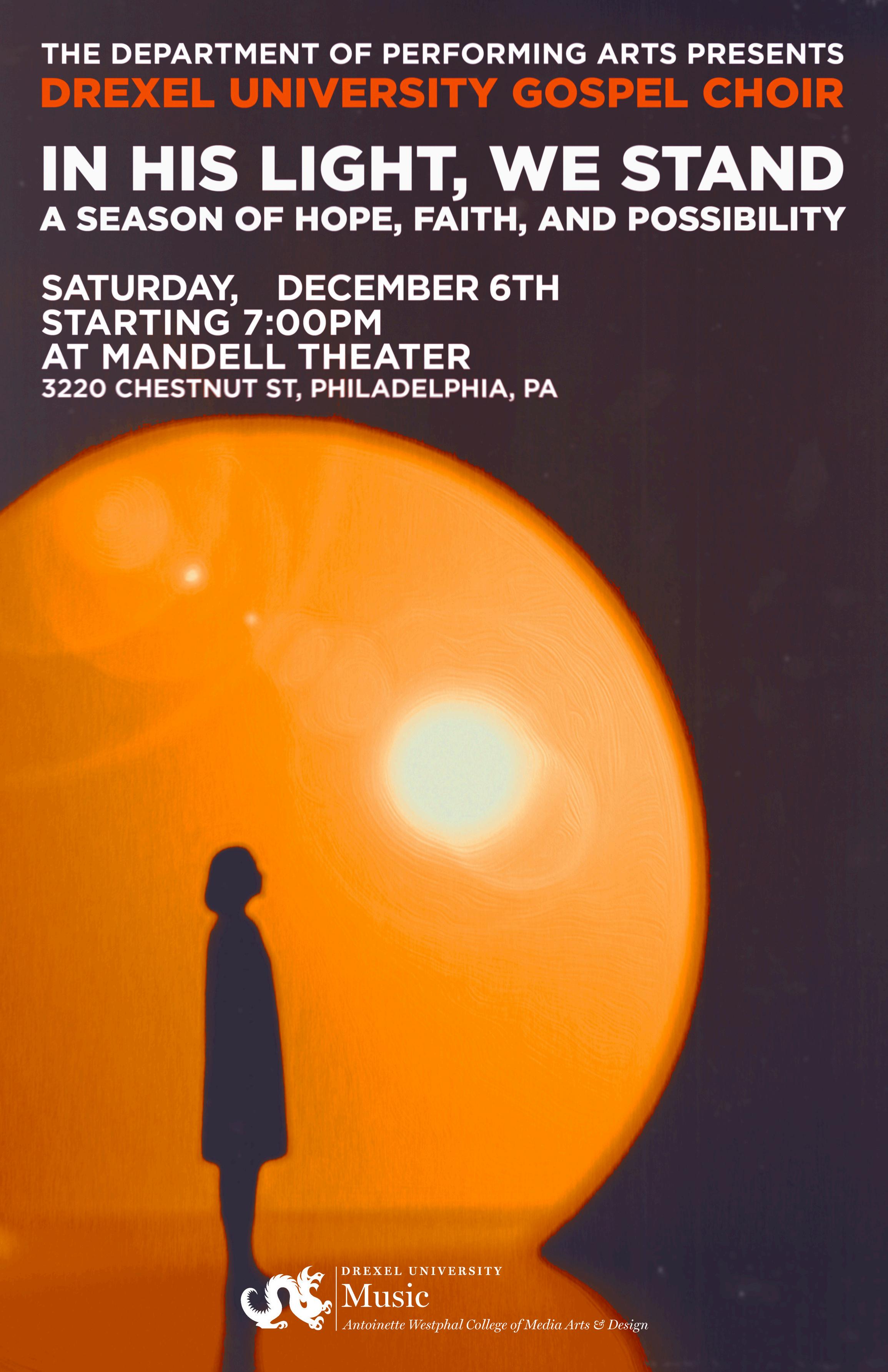 The Drexel University Gospel Choir would like to thank Dr. Miriam Giguere, Luke Abrusso and Westphal College of Media Arts and Design Staff and Faculty, Caroline Leipf, Lauren Tracy, Christopher Totora, and Mandell Theater Staff, Denise Marie Snow- Program Director for Bridges, Drexel University Gospel Choir Alumni, Rev. Gregory Ross - Senior Pastor and Rev. Beatrice E. Ross, First Lady, Vashti T. Gorham, Founder, Drexel University Department of Alumni Relations, Rev. Brian Musser – Campus minister DUBAC Program