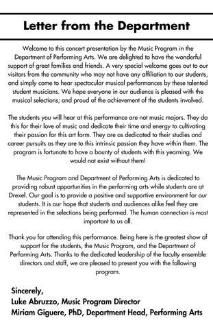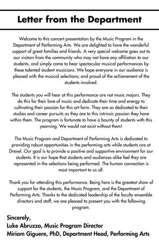 I hope you enjoy yourself tonight as much as I enjoy the privilege of working with the talented young artists at Drexel. Thank you for supporting live theater!