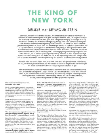 THE KING OF N E W YO R K DELUXE met SEYMOUR STEIN Early last December we received a call at the Record Shop from a Gentleman who wanted to commend us on what he thought to be a ‘great looking record shop’. This, i’m delighted to say, is not necessarily a rare occurrence as we quite often have people calling up or writing to us to say what a nice time they had at the shop whist passing through town. This particular morning the caller stood out however as he was phoning from New York. The elderly (his words not mine) gentleman had just seen us on the news and wanted to get in touch to say that he liked what we had to say and wanted to encourage us on the efforts we were putting in. Perhaps I should hold have started the story there. My shop had recently appeared on the Al Jazeera TV network, you see the town where we’re based was in full swing with a civil campaign to protest the opening of a Costa Coffee franchise, not to mention providing some austerity measures to avoid decline of our high street. I had been a talking head and the bit was one of that days rolling news items. I forget what I said exactly but it must have resonated particularly as it provoked an international call of good will. Seymour Stein had picked up the hone in his New York office and given us a call. No secretary, no PA, just the vice president of Sire and Warner Bros. Records on the phone because he thought we should know that what we’re doing is important. My kind of guy. After a couple missed phone calls we finally struck up conversation and have remained in touch since, sporadically talking about Calypso records. On a recent trip to his London office (he was in the UK in part to be presented as a LIPA Companion by Paul McCartney during the Institute’s graduation ceremony) Seymour took the time out to catch up with me and talk about record shops, records, and most importantly about the people who buy them. How important to sire’s early success were independent record shops? Record shops were always important to me, even as a kid. Syd Nathan of King Records, my greatest mentor, taught me early on that it was that last sale over the counter that really mattered; not how many records you pressed, not how many records you shipped out to distributors, and not how many records the distributor put in the stores. Rough Trade in particular was very important. Thankfully, they’re still going strong. In a way they were like an auxiliary A&R department for Sire. If they heard something and liked it, or thought I’d like it, they’d put it aside for me. They would also play me the new Rough Trade releases. Good people! They were very helpful. Incredibly so! Were there any stores who might still be around who were particular early supporters of the Sire label. I know Bleecker Bob’s was around till pretty recently. I knew Bleecker Bob very well. He had a partner called Broadway Al. The original store was near the corner of Bleeker and Broadway. That’s how they got their names. Bob was pretty crazy. Unfortunately, he had a massive stroke more than 10 years ago now, and never fully recovered. I was reading an article about you in Billboard Magazine (2012) where you noted that “39 of the 41 nominees on the first ballot for induction into the