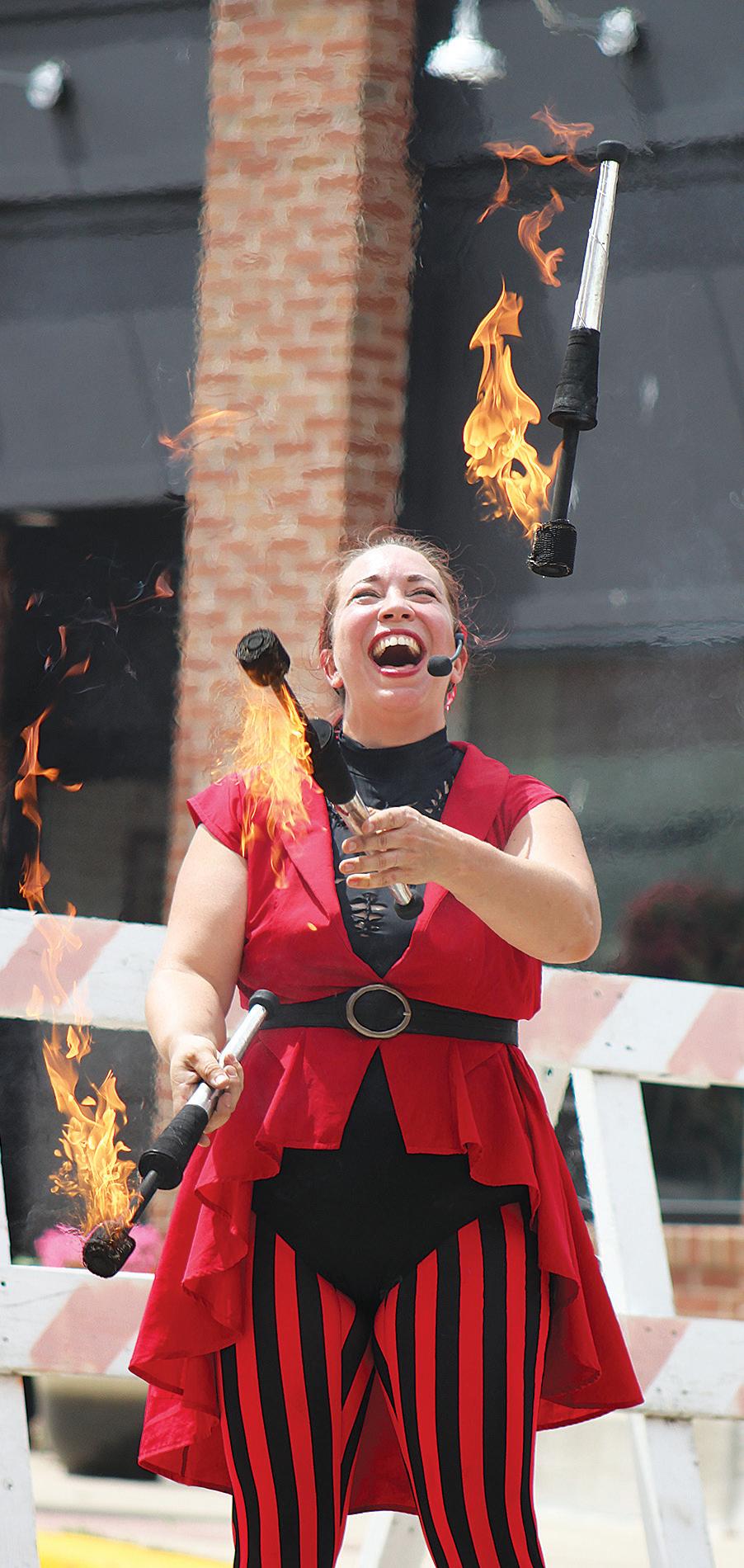 ABOVE- Laura Ernst laughed as she delivered a punchline while juggling flaming torches during her stunt show