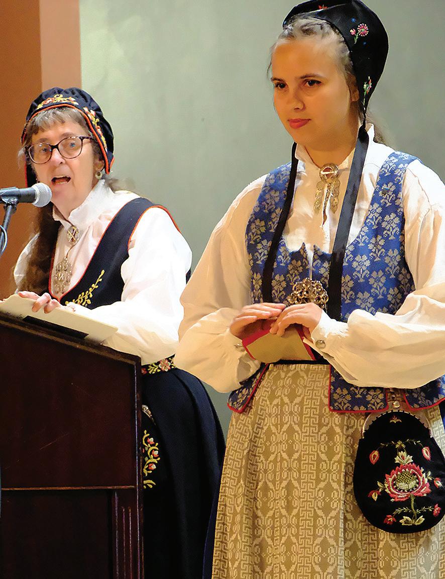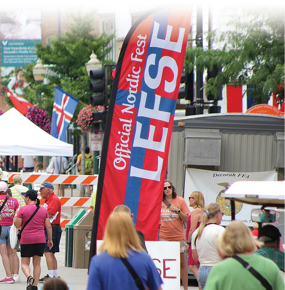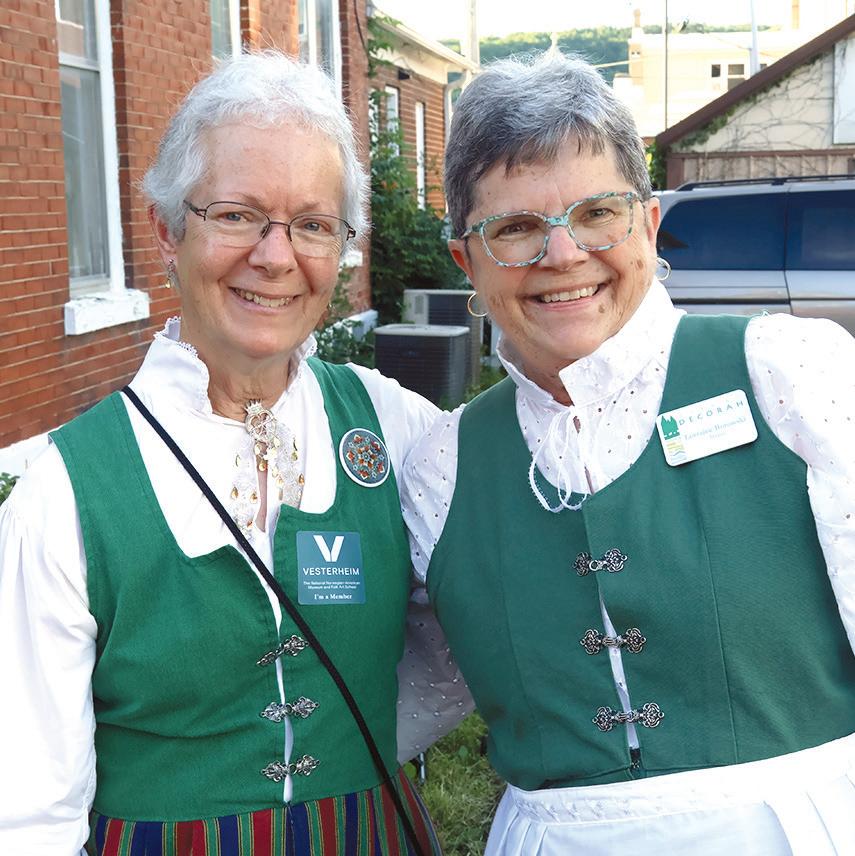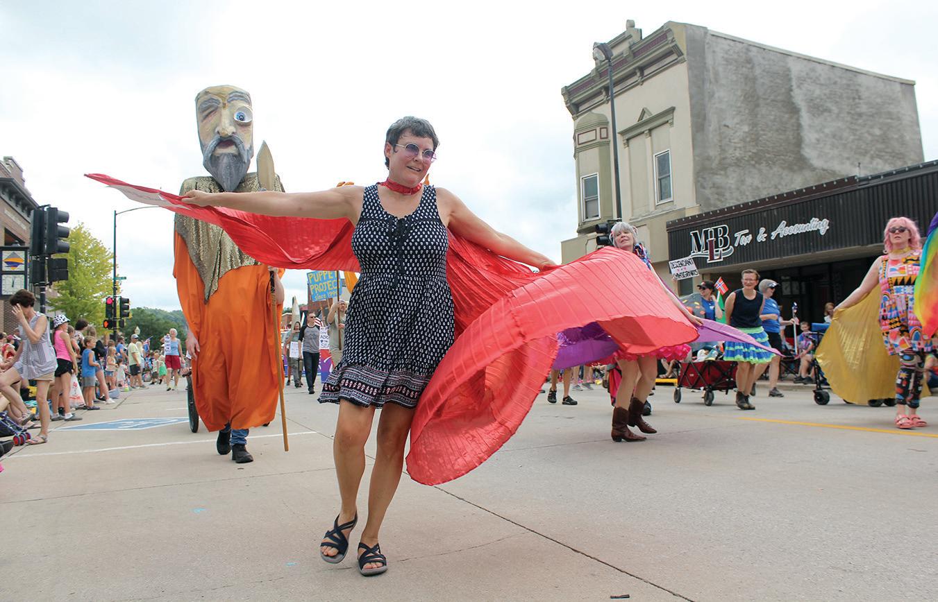 Members of Decorah’s Rainbow Trout Marching Club swirled their colorful capes through the air alongside large scale figures from The Puppet Project during Saturday’s Nordic Fest parade along Water Street (Photo by Seth Boyes) INSET- Representatives of Aase Haugen Senior Services donned some vintage styles before greeting the public during this year’s Nordic Fest celebration. (Photo by Denise Lana)