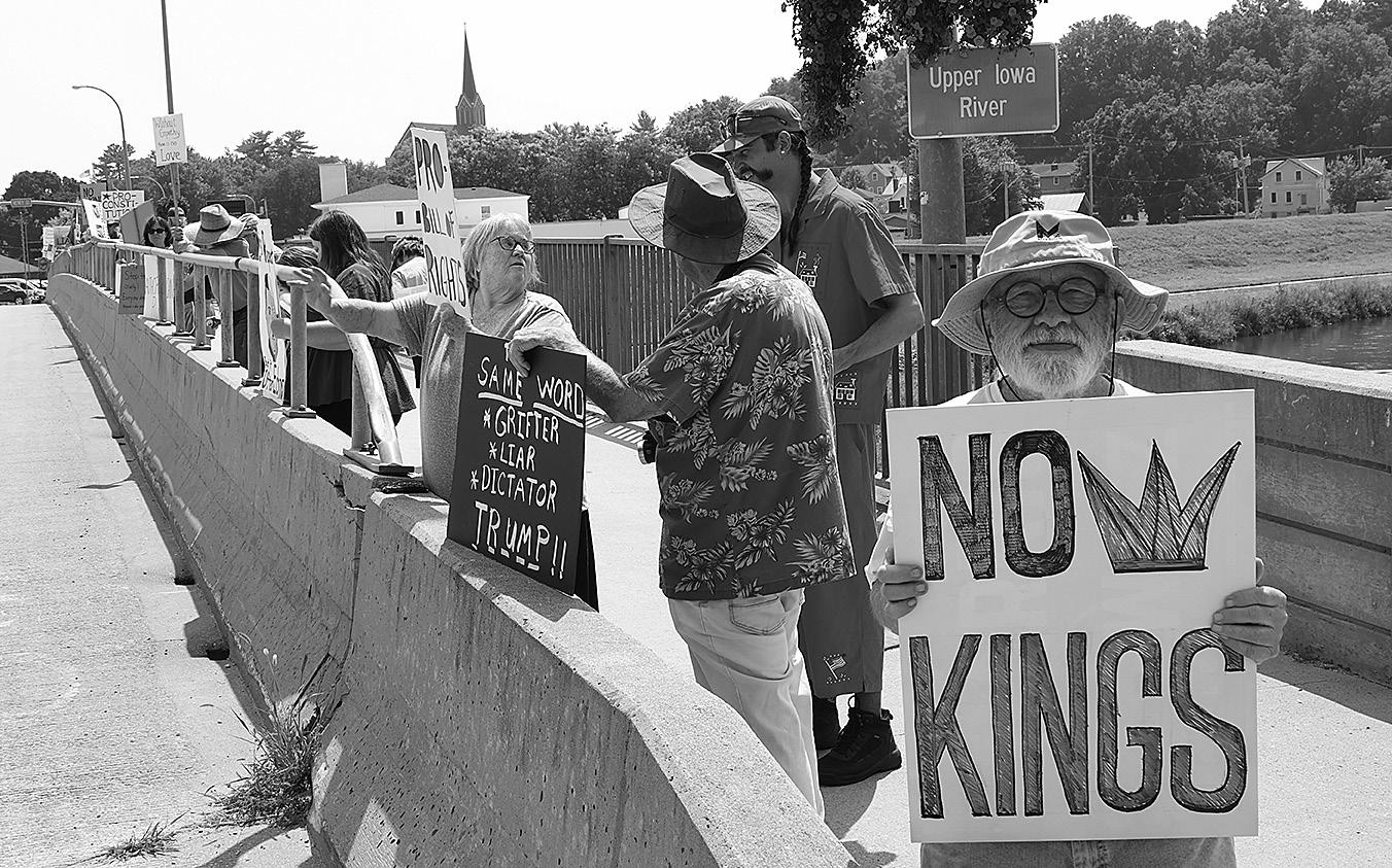 About 50 area residents representing up to four different organizations gathered Saturday on the College Drive bridge in Decorah to let their positions be known regarding President Donald Trump and the policies put in place since he took office for his second presidential term in January.