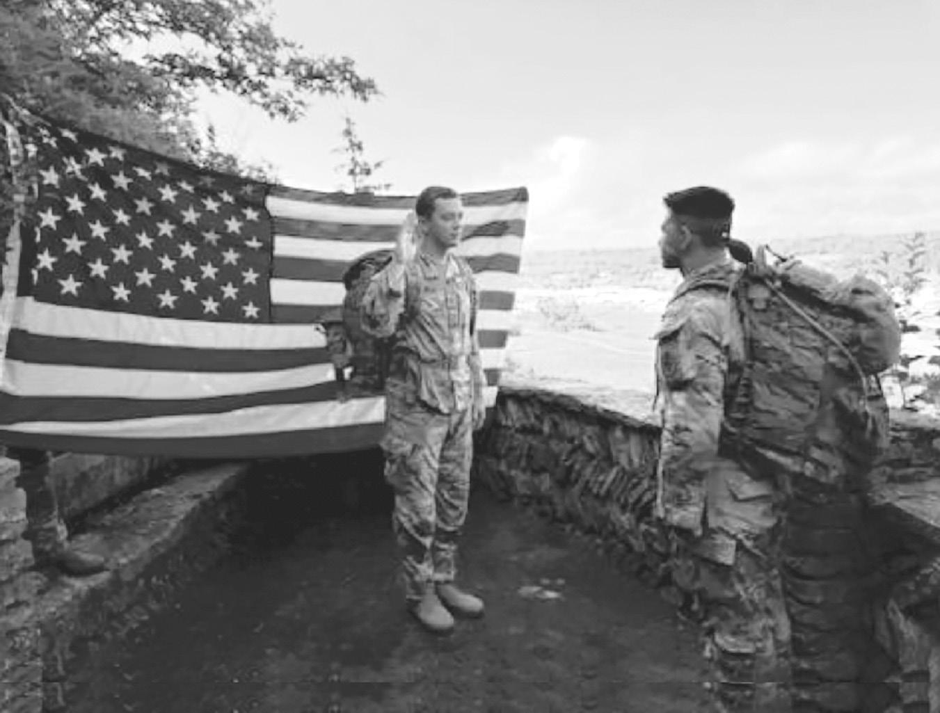 Members of the 527th MCT U.S. Army Reserve held its Battle Assembly weekend late last month in Decorah. The group conducted an Army fitness test on Saturday, July 26 and participated in the city’s annual Nordic Fest celebration by running in the Enveløpet 5K and marching in the Nordic Fest parade. The group’s training culminated in a ruck march on Sunday, July 27. Organizers said Sgt. Israel Salas of the 527th reenlisted at the end of the ruck march. Salas is pictured taking his oath with First Lt. Cmdr. John P. Marcella atop Pulpit Rock in Decorah. (Photo submitted)