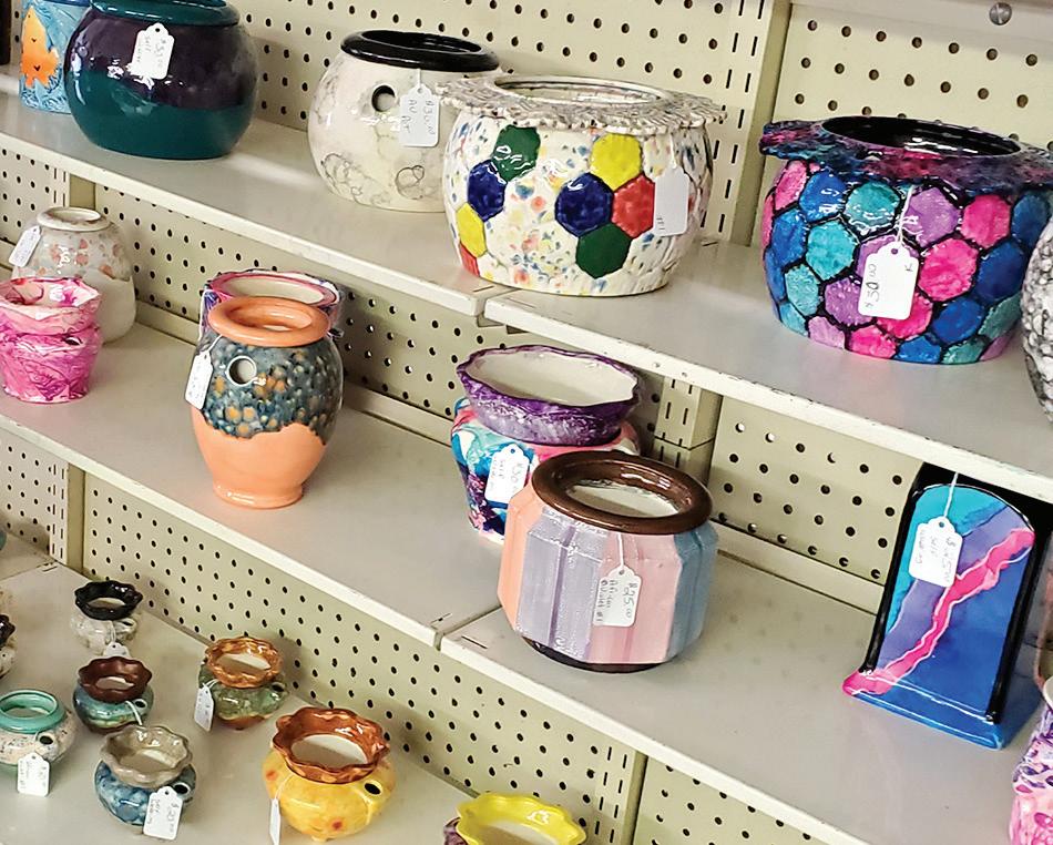 ABOVE- The ever-popular African Violet self-watering pots. Find one already painted and glazed or pick a style and paint it to your specifications. LEFT- Shelves are filled with a variety of ready to glaze ceramic pieces. The boutique offers a place to make Kollective Memories.