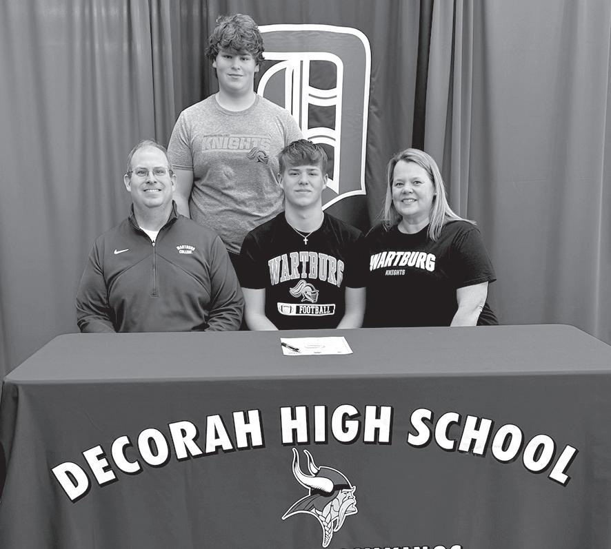 signed an American Rivers Conference letter of intent last week to participate in football at Wartburg College. During the past two years, Rhodes has been standout lineman on both the offensive and defensive side of the ball for the Decorah football program. As a two-year letterwinner and captain his senior year, he helped the Vikings to a playoff appearance this season. During this time, Rhodes earned first team all-district honors on the field while also receiving academic all-district and academic all-state recognition for his work in the classroom. Rhodes is the son of Mark and Britt Rhodes and also participates in Basketball, Golf and National Honor Society.