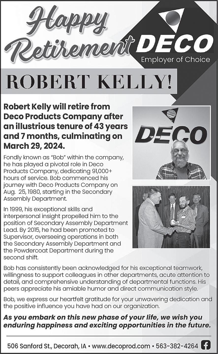 A presentation and book signing by Bob Kroll, author of “The Impact of a Father: A Daughter’s First Love”, will be held following Mass at St. Benedict Catholic Church in Decorah Saturday, April 6.