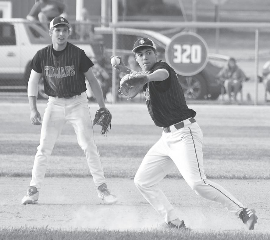 Trojan Caleb Kurtenbach is ready to fire to first in a game at South Winn last week while shortstop Carson Busta backs up the play. (Driftless Multimedia photo by Becky Walz)
