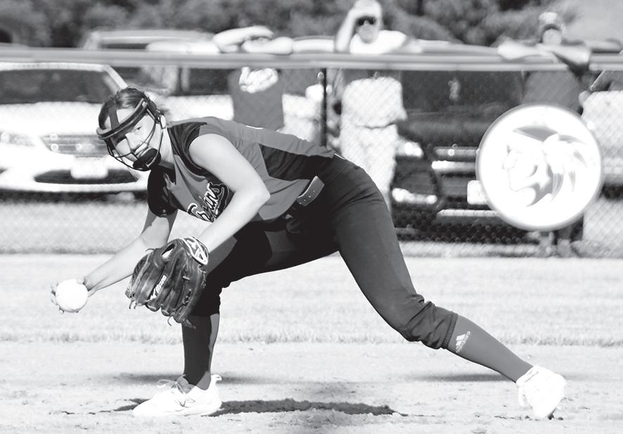 Decorah’s Sydney Kipp grabs the ball at first base for an out against Crestwood Thursday. (Photo courtesy of Nate Troy/ Cresco Times Plain Dealer)