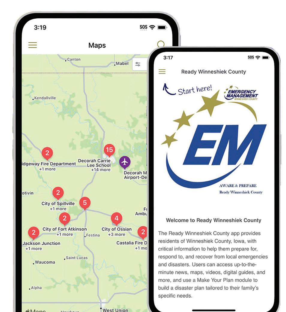 The “Ready Winneshiek County” app launched in early September and provides residents of Winneshiek County with critical information to help them prepare for, respond to and recover from local emergencies and disasters. Users can access upto-the-minute news, maps, videos, digital guides and more, and use a “Make Your Plan” module to build an emergency disaster plan tailored