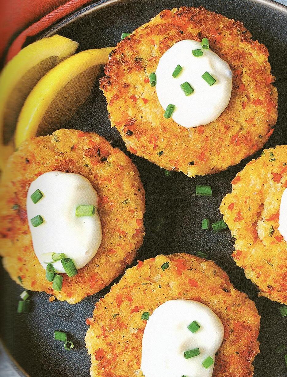 5. Spoon the lemon aioli over the shrimp cakes, and top with fresh chives.