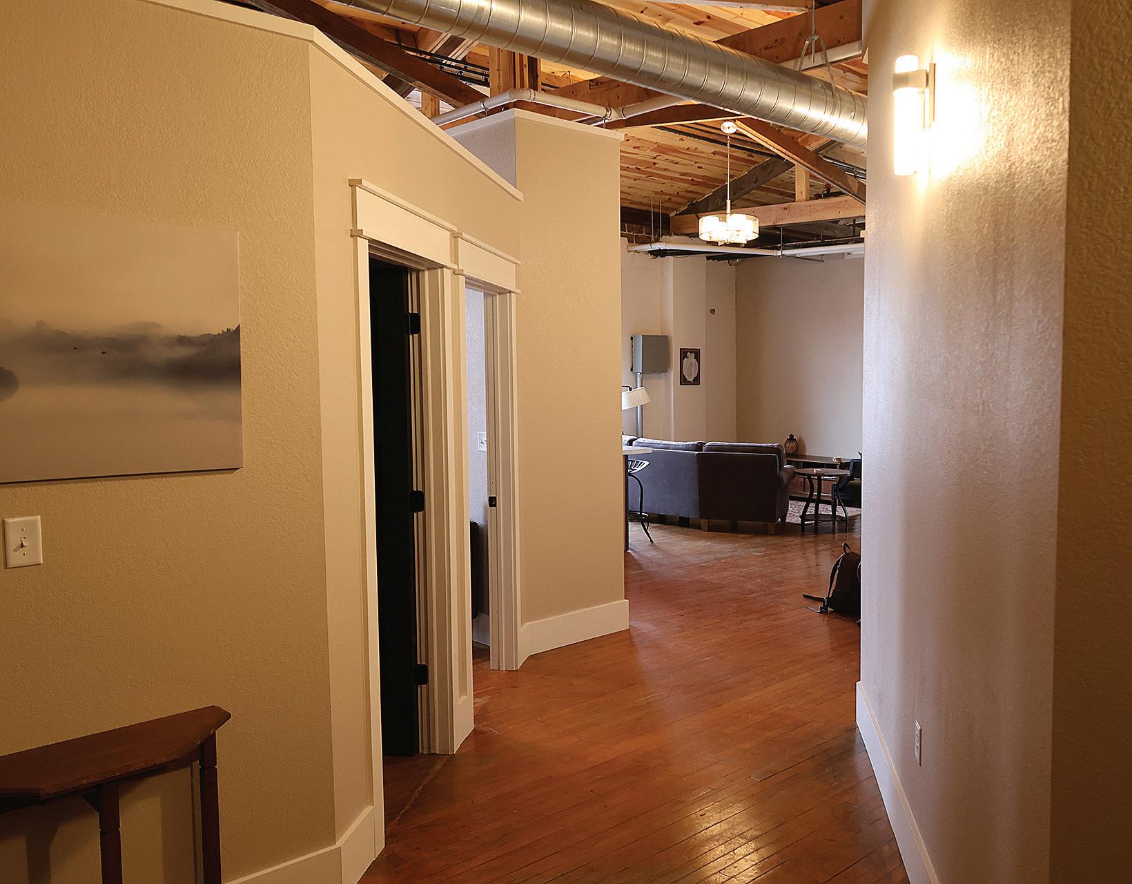 The office building’s upper level now features five apartments — three one-bedroom units, which are 850-1,000 square feet in size, and a pair of 1,250 square foot two-bedroom units. Rent for the smallest apartment is set at $1,375 per