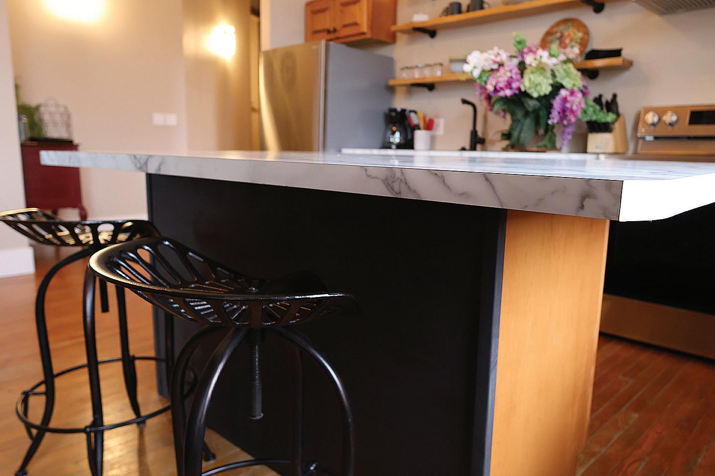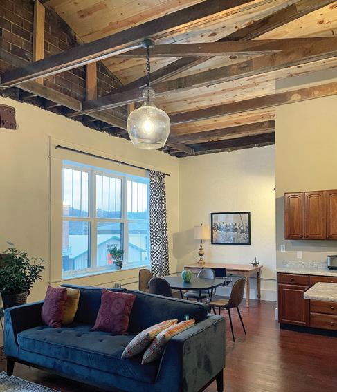 LEFT- Replacing the building's roof also meant replacing the joists holding it up, thus creating 18-foot-high ceilings in some areas of the apartments. BELOW-This kitchen island is on wheels, so it can be moved to the side in case of large gatherings. RIGHT- Space and lighting were priorities in designing the interiors of Meinholz's apartments. (Photos by Zach Jensen)