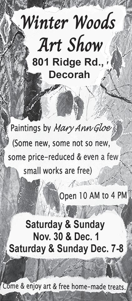 and rolls among the festively decorated trees from 8:30-11:30 a.m. Sunday, Dec. 8 in the clubhouse. Several home tours will be available during the celebration, including the homes of Alvin and Wendy (Mihm) Herold in Calmar; Ed and Mary Eileen (Lofte) Rickleman in Decorah; Karl Schroeder’s historic century-plus home in Ossian; and the Washington Prairie Lutheran Church in Decorah.