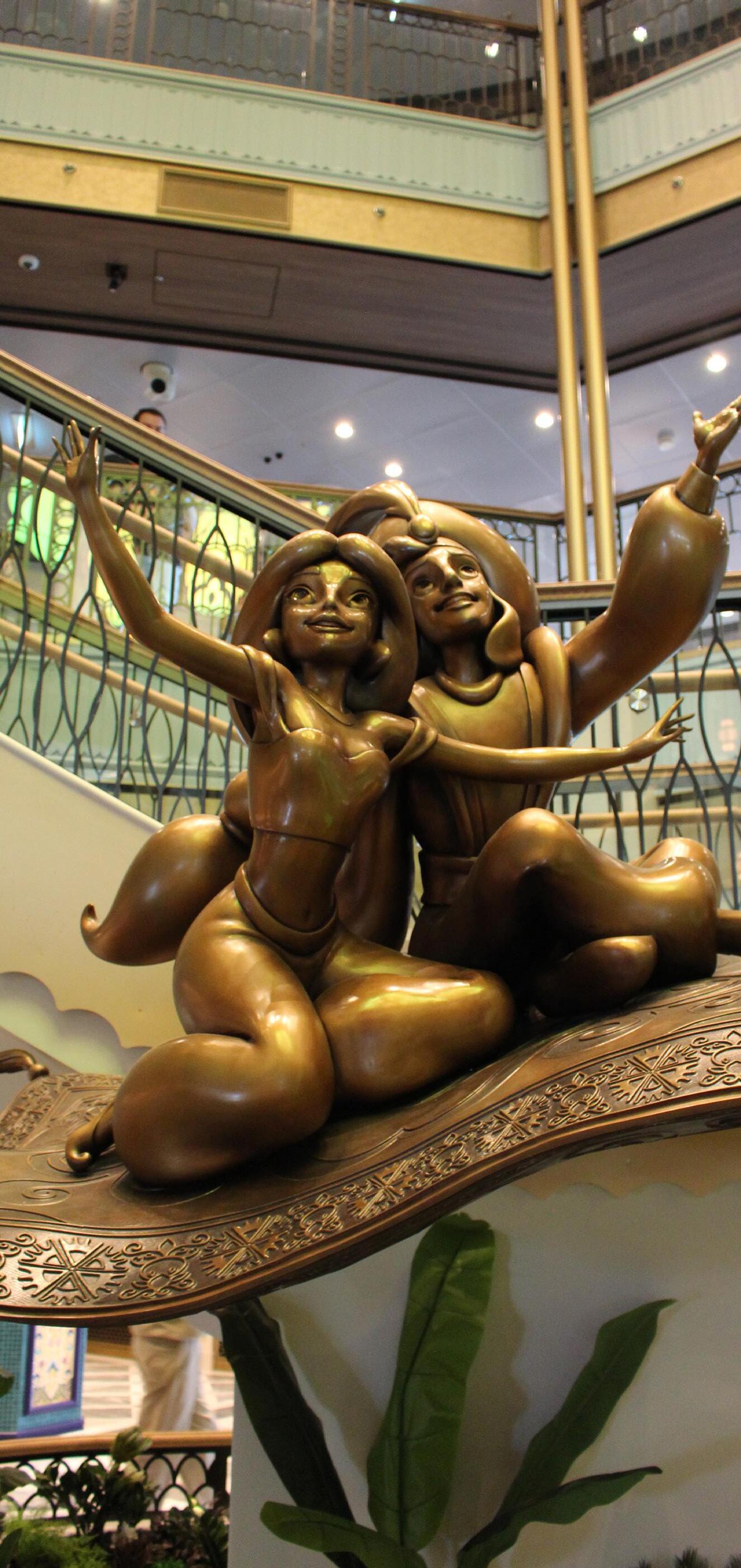 The first space you will be welcomed to while boarding is the Grand Hall – the heart of the ship. The tone is set when you are greeted by Aladdin and Jasmine themselves alongside the crew and some of your favorite characters. A focal chandelier glistens above illuminating the welcoming space surrounded by six smaller lantern fixtures, each paying homage to one of the other cruise ships. As far as first impressions go, the Grand Hall will give you a hint of the immersive storytelling ahead. On-board any Disney cruise you can always expect the pairing of