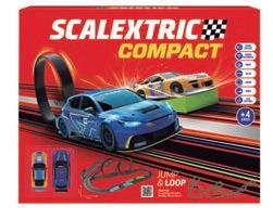 Circuito de la colección Scalextric Compact con un tamaño de 5.5 metros de pista con forma de trazado y mandos inalámbricos incluidos. Incluye doble looping y vallas. Contiene 2 vehículos de escalera 1:43 inspirados en un Formula 1 Rojo y un Aston Martin FA.