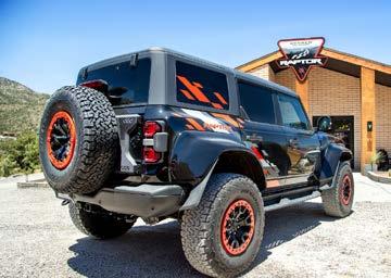 The new Code Orange package applies the Raptor family’s distinctive hue across the cabin and exterior of the Bronco Raptor. The body wears Code Orange-themed graphics on the rear fenders, while the tow hooks and beadlock rings on the 17inch Dark Carbonized Gray wheels add Code Orange, as well. In the cabin, customers can pair Code Orange seatbelts with either a Black Onyx or Blue with Black Onyx upholstery.