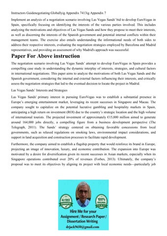 The negotiation scenario involving Las Vegas Sands’ attempt to develop EuroVegas in Spain provides a compelling case study in understanding the dynamic interplay of interests, strategies, and cultural factors in international negotiations. This paper aims to analyze the motivations of both Las Vegas Sands and the Spanish government, considering the internal and external factors influencing their interests, and critically assess the negotiation strategies that led to the eventual decision to locate the project in Madrid.