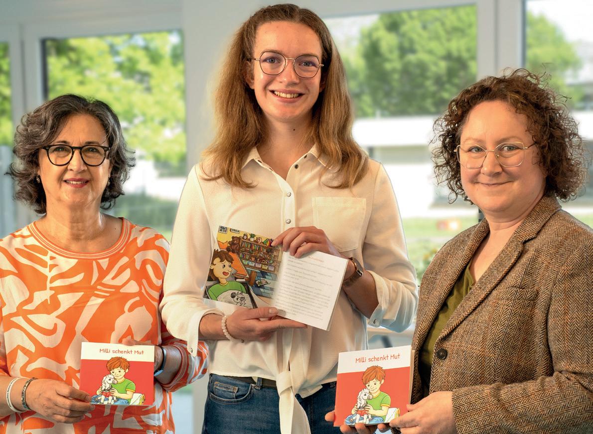 „In der einfühlsamen und kindgerecht erzählten Geschichte von Milli und dem kleinen Lukas, der einen Unfall hatte, geht es um den hohen Wert von Hilfe, Freundschaft und Trost“, so Nilgün Özel, Vizepräsidentin des DRK-Landesverbandes Westfalen-Lippe. „Milli“ ist der Name des Tröstepferdchens, das viele DRKRettungssanitäter in Westfalen-Lippe seit 2020 an Bord ihrer Rettungswagen haben. Für die Einsatzkräfte ist es zuweilen schwer, Zugang zu einem verunfallten Kind zu finden, um zum Beispiel zu erfahren, wo es Schmerzen hat. Ím Fall leichter Verletzungen können sie durch den Einsatz von „Milli“ Vertrauen aufbauen. Denn die kleine Trostspenderin vermag die Kinder etwas abzulenken und lässt den Unfall in den Hintergrund treten. Kreiert hat das Pferdchen Nilgün Özel, benannt wurde es nach Kamillus von Lellis, dem Schutzpatron der Pflegekräfte. Gemeinsam mit Autorin Dr. Mareike Menne und Illustratorin Vera Gerstenberger stellte sie das Büch „Milli schenkt Mut“ bei einer Lesung in der DRK-Kita „Karlstraße“ in Bad Lippspringe vor. Alle DRK-Kitas in Westfalen-Lippe haben inzwischen ein Exemplar des Buches erhalten. Interessierte können das Kinderbuch (v.li.)