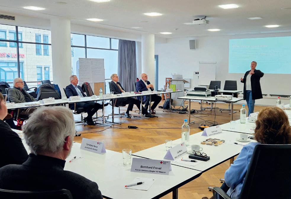Zur diesjährigen Tagung der Justitiare und Konventionsbeauftragten in Bochum begrüßte Landesjustitiar Heinz-S. Gosmann rund 20 Teilnehmende. Referent*innen waren die Leiterin des Verbindungsbüros des DRK und des Bundesamtes für Bevölkerungsschutz und Katastrophenhilfe in Berlin, Dr. Heike Spieker, und Ministerialdirigent Dr. Andreas Christians vom Justizministerium NRW. i+t