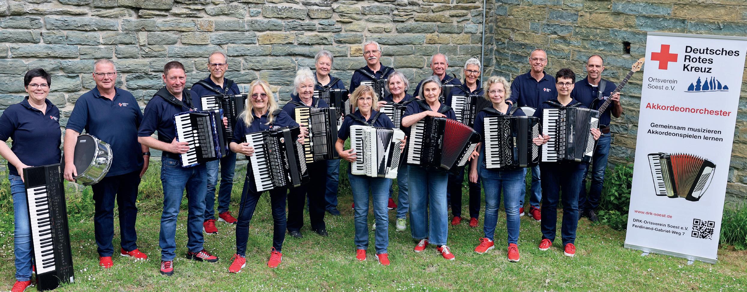 Aktuell zählt das Akkordeonorchester – inklusive Schlagzeuger, Bass-Gitarrist und Keyboarderin – 19 Köpfe. Sie alle sind Mitglieder des DRK-Ortsvereins Soest, dessen Rotkreuzleiterin Sabine Große-Berkhoff seit 2020 ist.