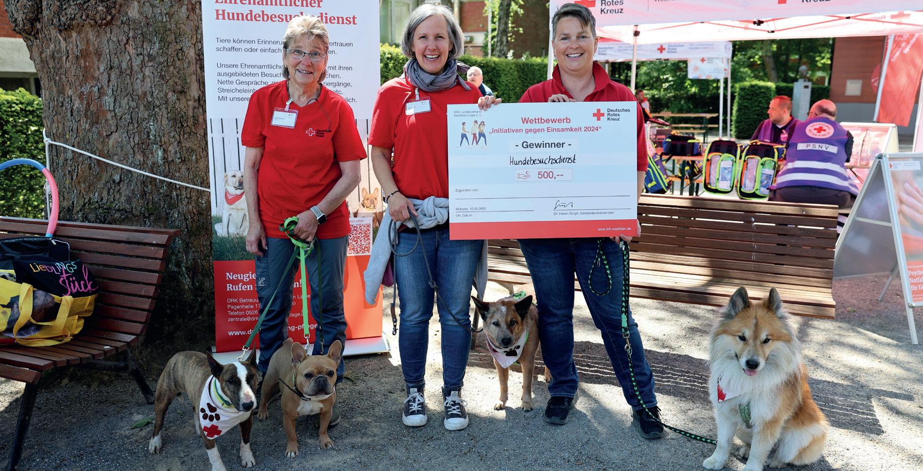 wie „Spontanhilfe“, „Künstliche Intelligenz“, „Gewinnung von Ehrenamtlichen“ oder „Vorbereitung auf einen Stromausfall“. Auf einem bunten Markt der Möglichkeiten wurden unter anderem Beispiele aus der Rettungshundearbeit, der Kältehilfe, der Bergwacht, der Schwimmförderung oder dem inklusiven Ehrenamt des DRK in Westfalen-Lippe vorgestellt. Den Wettbewerb „Initiativen gegen Einsamkeit 2024“ mit einem Preisgeld von 500 Euro gewann der ehrenamtliche Hundebesuchsdienst der Betreuung und Pflege in Lippe gGmbH aus dem DRK-Kreisverband Lippe. Birgit Klöpping, Nicola Löhr und Stefanie Jungblut waren mit ihren Hunden stellvertretend für ihr ganzes Team nach Münster gekommen. Nachdem die Teilnehmer*innen der FEAT-Eröffnung den Hundebesuchsdienst über einen QR-Code live auf den