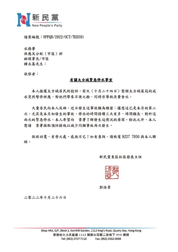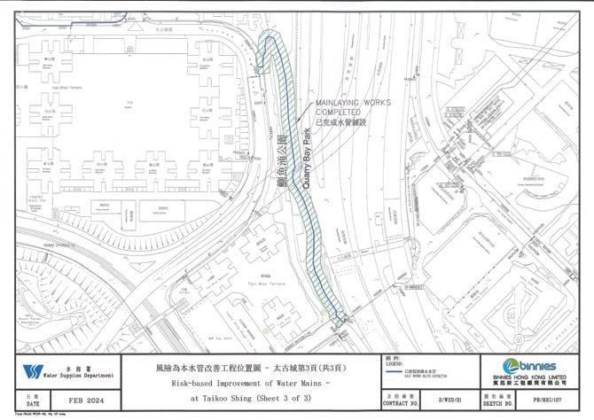 自2022年底開始,浩景便與水務 署跟進太古城的水源供應情況。事實 上,水務署一直有為太古城進行了水管 翻新工程,更換所有公家喉管。以往,太 古城的食水及鹹水一直依賴屋苑西邊近華蘭路的兩條主要喉管。去年11月,